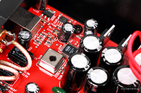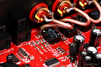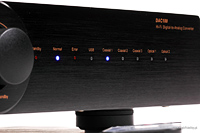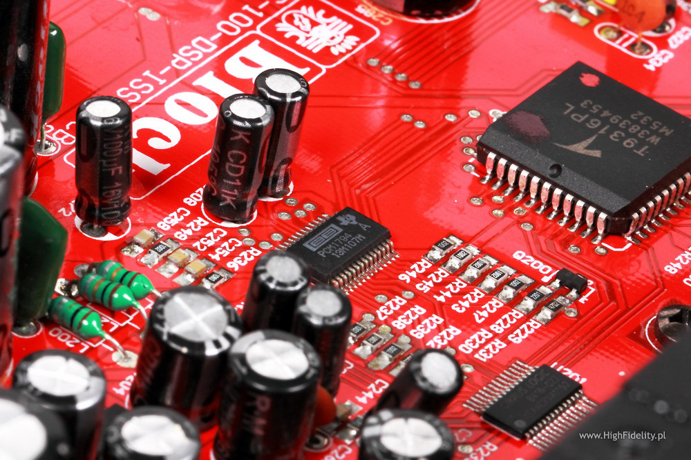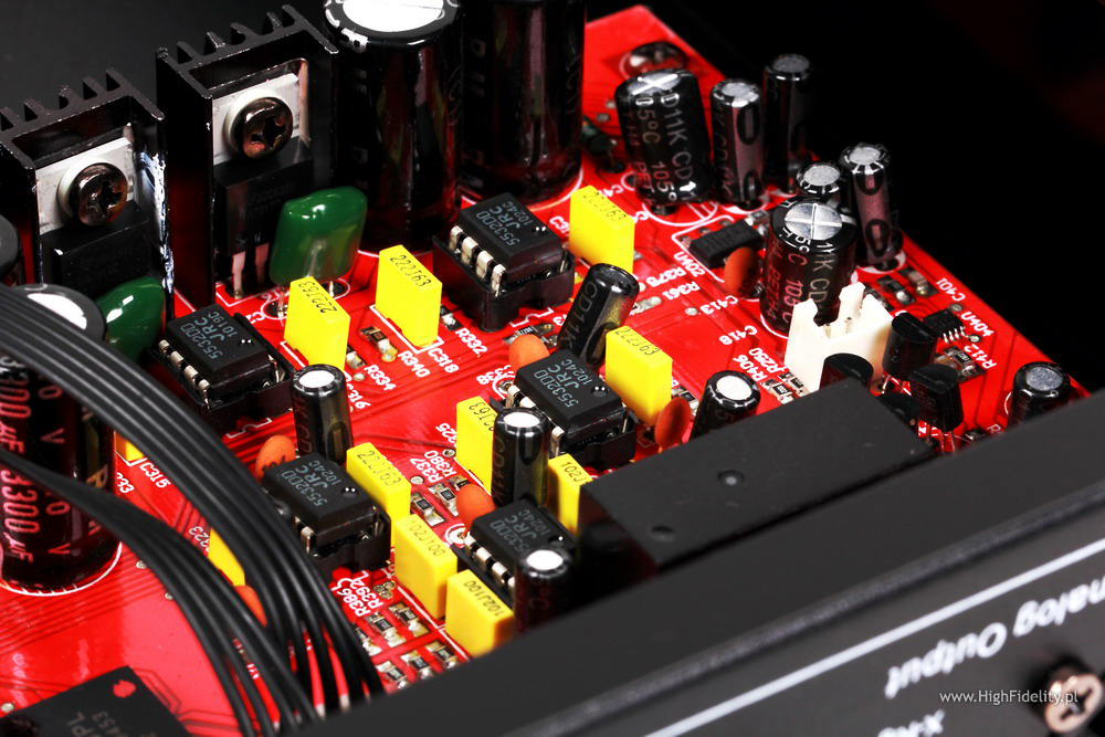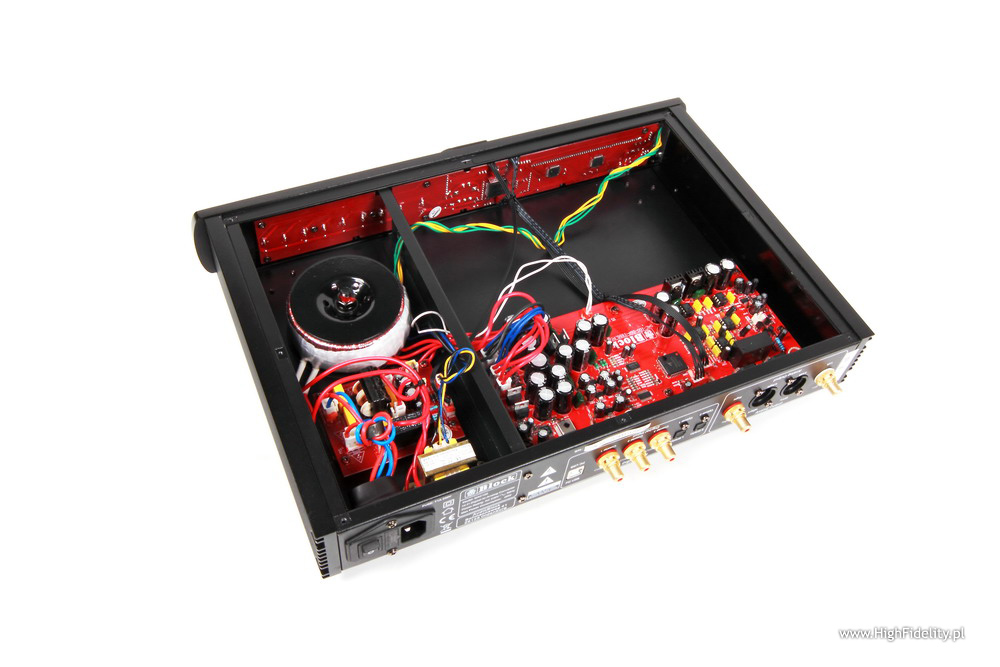 Wejścia RCA sprzęgnięte są z układem transformatorami dopasowującymi impedancję, co w pewnej mierze uniezależnia nas od interkonektu. Sygnał trafia następnie do układu Cirrus Logic CS8416, odbiornika cyfrowego 24/192. Przetwornik cyfrowo-analogowy to kość Burr Brown PCM1794, układu 24/192 o niezłej dynamice (127 dB). Sekcję analogową umieszczono w pewnej odległości od cyfrowej, wraz z rozbudowanym zasilaczem. Zdecydowano się w niej zastosować super-klasyczne układy scalone, model JRC5532, we wszystkich stopniach: konwertera I/U, wzmacniacza i bufora wyjściowego. Dodajmy jeszcze, że wejście USB obsługiwane jest przez klasyczną kość odbiornika Tenor TE7022, układ asynchroniczny 24/96.
