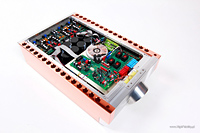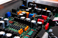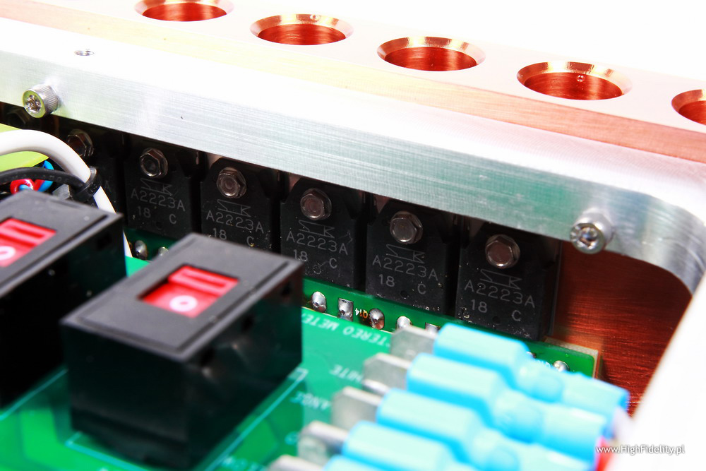 Układy elektroniczne zmontowano podobnie, jak we wzmacniaczach lampowych, tj. na „plecach” – są podwieszone pod górną, najgrubszą ścianką. Aby poprawić ekranowanie przykręcono do niej od środka grubą płytę z miedzi. Układ elektroniczny podzielony jest między kilka płytek. Sekcja wejściowa została zmontowana na jednej, umieszczonej tuż przy tylnej ściance. Układ jest w całości tranzystorowy i wykorzystano w nim fantastyczne elementy bierne – wszędzie mamy precyzyjne oporniki Dale’a, mikowe kondensatory CDM firmy Cornell Dubilier, polipropyleny Wima i inne. Sekcja ta ma własne zasilanie, z osobnym transformatorem toroidalnym. Ten przykręcono do aluminiowej płyty, ekranującej od spodu chyba najszerszy transformator toroidalny, jaki widziałem. Zasilanie do końcówek filtrowane jest w ośmiu, bardzo dobrych kondensatorach firmy Panasonic. Końcówki mocy umieszczono po obydwu stronach – pracuje w nich po sześć par tranzystorów mocy na kanał – to Sankeny 2SA2223+2SC6145. Także tutaj elementy bierne są najwyższej klasy.