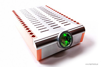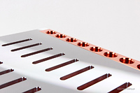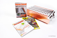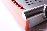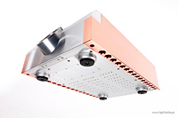 Wzmacniacz jest zaskakująco mały, ale bardzo ciężki – to 40,8 kg żywej wagi skupionej na bardzo małej powierzchni, w niebywale solidnej, aluminiowo-miedzianej obudowie, wykonanej z frezowanych płaskowników. Nie znajdziemy tu klasycznych aluminiowych radiatorów, a grube miedziane płyty z nawierconymi otworami. Te mają kształt podwójnego lejka – przy wylocie mają średnicę 19 mm, a pośrodku 12 mm. Przewodność cieplna miedzi jest o 91% wyższa niż aluminium, dlatego nie są potrzebne klasyczne pióra pomagające w wytraceniu ciepła.