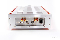Uwagę zwraca jednak przede wszystkim wskaźnik mocy wyjściowej, wykonany tak, aby przypominał bulaj statku podwodnego (kapitana Nemo z powieści Verne’a) lub luksusowe zegarki niektórych producentów. Jego podświetlenie jest zielone. Nigdzie nie widać wyłącznika sieciowego – znalazł się na dolnej ściance, blisko przedniej krawędzi. Z tyłu mamy gniazdo sieciowe IEC zintegrowane z bezpiecznikiem, dwie pary gniazd głośnikowych, wejścia zbalansowane XLR oraz małe przełączniki, którymi regulujemy czułość wskaźników mocy i jasność podświetlenia. Gniazda głośnikowe są bardzo blisko siebie i bałbym się wkręcić do nich wtyki widłowe. Jeden kanał jest też bardzo blisko kabla sieciowego. Pomiary w „HiFi News & Records Review” pokazują, że skutkuje to gorszym o 5 dB odstępem sygnału od szumu – taka różnica nie powinna być jednak słyszalna. Wejścia są tylko zbalansowane, ale jeśli chcemy skorzystać z niezbalansowanego przedwzmacniacza (co jest popularne np. w Japonii), należy wykorzystać dołączone do kompletu przejściówki.