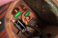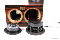 Głośniki ustawione są odwrotnie niż zwykle, tj. wysokotonowy umieszczono pod niskośredniotonowym. Dzieli je zwrotnica pierwszego rzędu. Zmontowano ją sposobem punkt-punkt, lutując wyprowadzenia elementów bezpośrednio do siebie, bez pośrednictwa płytki drukowane. To najlepsza, ale i najdroższa metoda. Kable połączeniowe są lutowane zarówno do płytki, jak i do głośników. Choć to tylko dwa głośniki, w zwrotnicy znajdziemy aż cztery cewki (wszystkie powietrzne!), cztery kondensatory, w tym jeden polipropylenowy oraz cztery oporniki. Najwyraźniej zastosowano w niej pułapki linearyzujące impedancję (ułatwiającą wysterowanie kolumn).