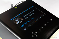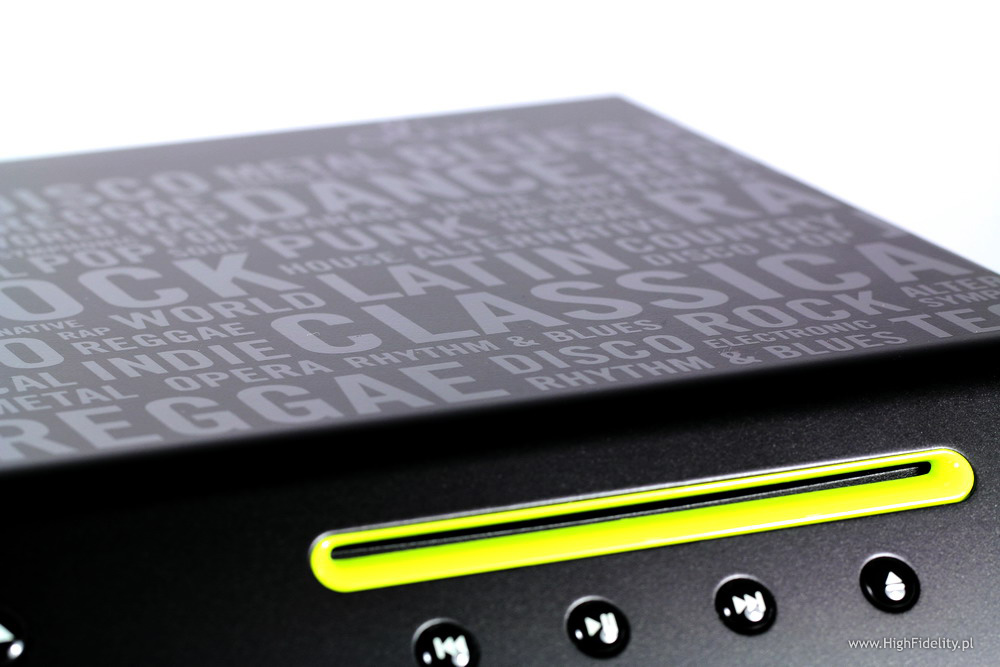 In the middle there is a color display with a 4.3” diagonal (480 x 272 pixels) which shows the disc cover and information about the status of the player. And the setup. Important is the fact, that it is a touchscreen! The company offers also a free application for the Apple portable devices (iPod and similar), which can then function as a remote for the O2M. There are not many switches, there are the basic buttons for controlling playback like in a classic CD player, there is a standby switch and some buttons to navigate the menu. The front is clean and nice, what is underlined by the special finish of the surface – this is not brushed aluminum, but aluminum covered with writings, fading in the background. Those writings are the names of musical genres: jazz, alternative, rock, etc.