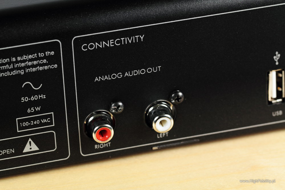 There are not many connections on the back – there is an analog, stereo RCA output, a digital TOSLINK and RCA output and a Wi-Fi antenna. Only the connector for the antenna is gold plated, while all the others are of very low quality. The RCA are close together, excluding usage of thick plugs. Close together are also the ports related to data transfer – Ethernet and USB. Let us add, that to the side there is a socket for the external power supply 6V 3A. I think that changing it (it is a switching one) will benefit the sound.