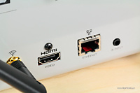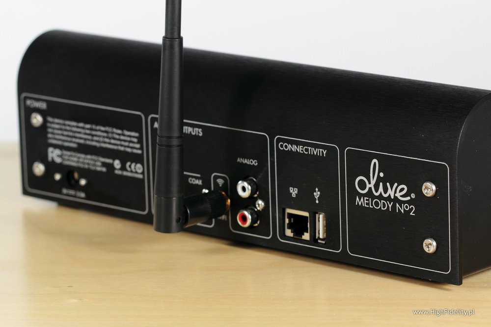 O2M This is the smallest Olive player. It was designed to be a “client”, an external unit working together with a “central unit” – in this case the Olive O4HD or O6HD players. Hence the qualification of this unit in the company materials – it is called a “multi-room player”. This is so, because we can use up to 15 of those units in parallel in different rooms. The signal can be supplied from a NAS disk or a computer, if those are working in a network. The network signal can be supplied via an Ethernet cable or wireless (Gigabit Ethernet, 802.11g WEP, WPA, WPA2, 64- and 128-bit) – there is a single antenna on the back. The sharing of the files must be using UPnP servers.From outside the O2M looks very nice. This is a small device, with a sloped top cover, which has the function of the front panel. It is made from a thick, aluminum plate, bent in such a way, that it becomes the front, top and back cover. This is a rigid and nice cover.