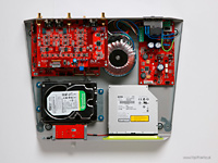 Inside we can see different PCBs. The biggest one houses the audio circuits. In the beginning of the signal path there is an upsampler, a chip from Burr-Brown, the SRC4194, converting all signals to the form 24bits/384kHz. Next to it there is a nice word clock. Next there are three, identical, paired DACs, Burr-Brown PCM1792A. There are three of them, because the path for the unbalanced outputs and balanced ones is separate – I saw something similar in hi-end Accuphase players.Converting current to voltage (I/V conversion) is made in the splendid TPA6120A2 chips. The output amplification is also IC based. This unit works with a current feedback loop. Let us add, that those chips have a very quick slew rate 20V/μs, and we have 2. order Bessel filters with a slope of 12dB/oct.
