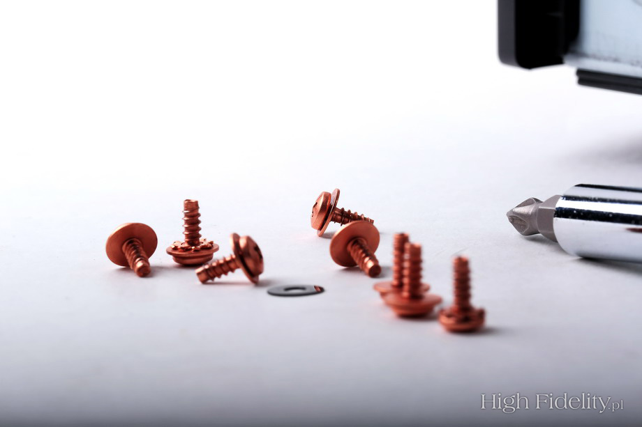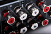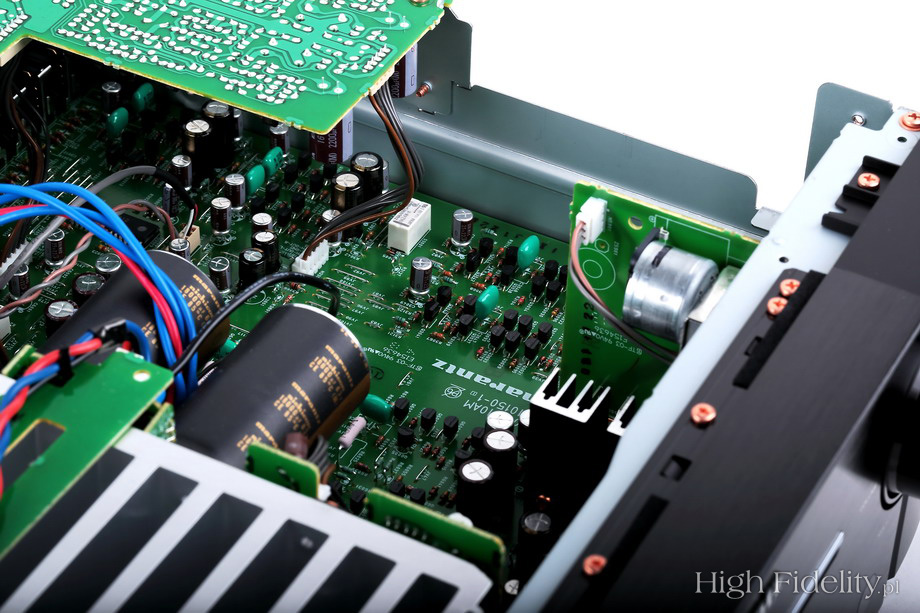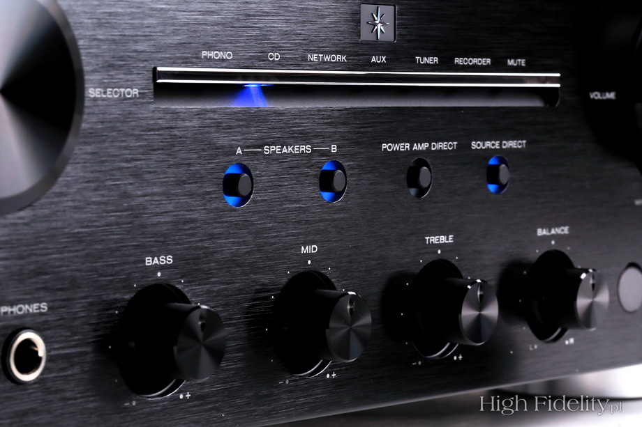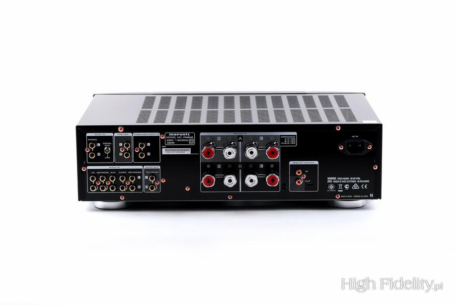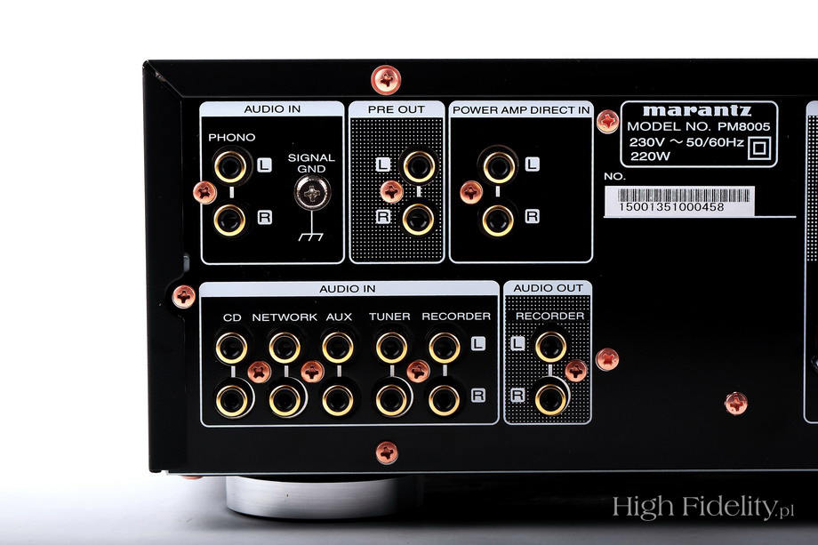 Nad gałkami mamy przyciski – wybierające aktywne wyjścia (A, B), wejście na końcówkę mocy (np. w systemie kina domowego) i wspomniany „Source Direct”. Guziki są podświetlane niebieską obwódką. Jeszcze wyżej, w zagłębieniu, pod chromowanym paskiem, są niebieskie diody pokazujące wybrane wejście. Poza tymi elementami mamy tu jeszcze gniazdo słuchawkowe oraz wyłącznik sieciowy. O solidnych gniazdach głośnikowych już wspomniałem. Marantz od lat korzystał z poddostawców, ale chyba od roku montuje w nowych modelach zaciski wykonywane specjalnie dla niego. Są duże, wygodne i noszą numer SPKT-1. Obwódka tutaj (zewnętrzna tuleja) jest pokryta metalem o srebrnym kolorze, a np. w modelu SA-14S1 miedziowana. Zacisków jest osiem – dwie pary dla każdego kanału. Gniazda RCA podzielono na dwie sekcje – na górze jest wejście gramofonowe (MM, 2 mV/47 kΩ), wyjście z przedwzmacniacza i wejście na końcówkę. Na dole ulokowano pozostałe gniazda: pięć wejść stereofonicznych i jedno wyjście do nagrywania. Dostajemy też gniazda systemu sterowania Marantza oraz gniazdo sieciowe IEC (bez bolca ochronnego).