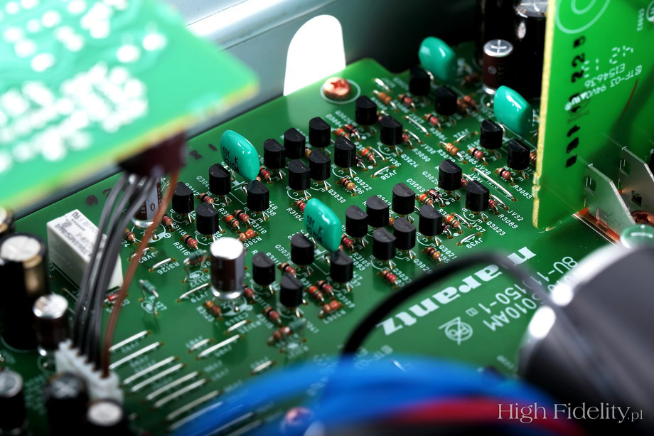 Podział gniazd na tylnej ściance jest odbiciem podziału wewnątrz – przedwzmacniacz gramofonowy otrzymał osobną płytkę drukowaną. Zwykle robi się go na scalaczku, a tutaj otrzymał rozbudowany układ tranzystorowy – moduły HDAM. Te ostatnie są częścią całej płytki, nie są wydzielane, ale w 14S1 Marantz wraca do małych płyteczek wpinanych do głównej. Tak wyglądały niegdyś HDAM-y przez wiele, wiele lat. ![]() Dane techniczne (wg producenta) Moc wyjściowa: 2 x 70 W/8 Ω | 2 x 100 W/4 Ω ![]() Dystrybucja w Polsce: |