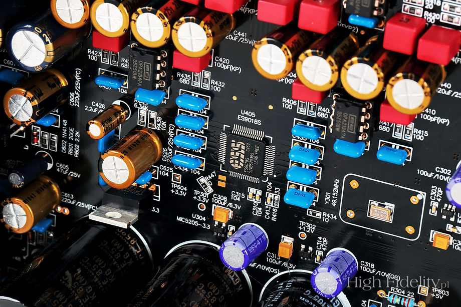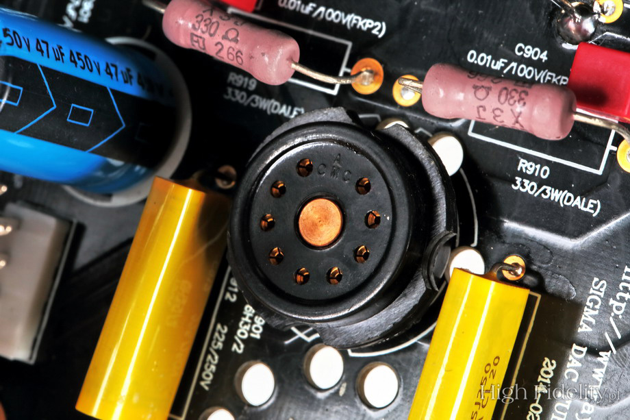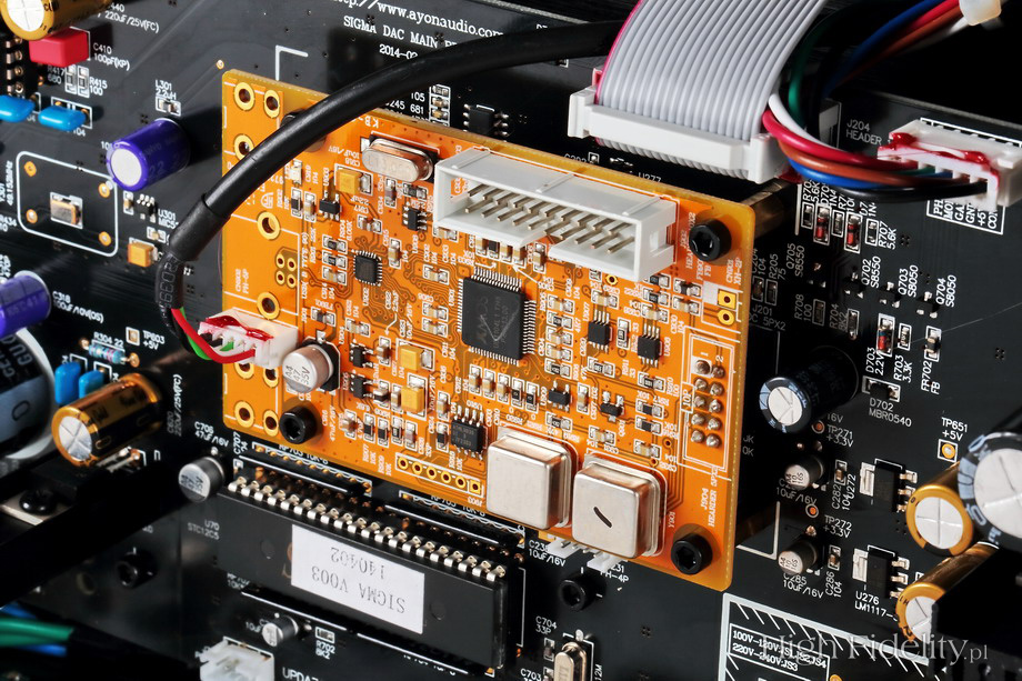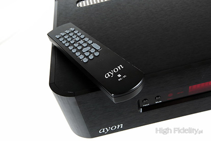 To wszystko dostajemy z wejść elektrycznych z wykorzystaniem wysokiej klasy zewnętrznego napędu CD. Z odtwarzaczem plików nieco zmniejsza się rozdzielczość, bez względu na to, z jakiego rodzaju plików korzystamy. Wejście USB brzmi w bardzo ujmujący sposób i da wiele radości wszystkim, którzy skorzystają z komputera, albo odtwarzaczy plików z takim wyjściem, np. Aurendera. Tomek, właściciel Stratosa używa Aurendera X100L i gra to znakomicie. Myślę jednak, że wciąż dobrze odtworzona dobrze przygotowana płyta CD brzmi w bardziej spójny koherentny i bardziej rozdzielczy sposób. Narażam się wielu, ale nie mogę mówić inaczej niż myślę. Wyjątkiem są pliki DSD. Szkoda, że to tak niszowy format, bo dobrze przygotowany, tj. nagrany jako DSD dźwięk jest obłędny w spokoju, gładkości, miękkości. ![]() Z zewnątrz wszystkie trzy urządzenia różnią się detalami, na przykład brakiem gałek zmiany wejść i siły głosu w Sigmie. Nieco inne są również ich wymiary wewnętrzne od 48x42x11 cm, poprzez 48x40x11 cm do 48x36x11 cm w „daku”, który testujemy. Inną mają też wagę: 17 kg, 16 kg i 12 kg. Mimo to, patrząc na dowolne urzadzenie, nie będziemy mieli cienia wątpliwości z jaką firmą mamy do czynienia. To oczywiście sprawka obudowy: aluminiowej, z grubych płyt i kształtowników, z zaokrąglonymi rogami, anodowanej na czarno. W droższych produktach Gerhard Hirt, właściciel i główny konstruktor, dodaje chromowane gałki. Obudowy firma wykonuje samodzielnie, w kupionej kilka lat temu przez Gerharda firmie w Hong Kongu. Elementem wspólnym jest też duży wyświetlacz na przedniej ściance w czerwonym kolorze. Informacje pokazywane są na nim w dwojaki sposób: na wyświetlaczu typu dot-matrix oraz na podświetlanych ikonkach. Na tym pierwszym odczytamy wybrane źródło i poziom siły głosu. Ikonki poinformują nas np. o częstotliwości próbkowania sygnału wejściowego (ale nie o ilości bitów) i jego rodzaju – PCM lub DSD. Jeśli przetwornik nie jest zsynchronizowany z nadajnikiem, wyświetlacz miga. Sigma jest przetwornikiem cyfrowo-analogowym z wbudowanym przedwzmacniaczem (regulacją siły głosu, bez wejść analogowych). W materiałach nie znajdziemy informacji, że to przedwzmacniacz analogowy, zakładam więc, że skorzystano z cyfrowej regulacji siły głosu w kości przetwornika D/A. Urządzenie przyjmuje sygnały PCM do 32 bitów i 192 kHz oraz DSD64 i DSD128. Normalnie powiedziałbym, że sygnał DSD dotyczy jedynie wejścia USB. Gerhard ma jednak wyraźną słabość do tego formatu, wyniesioną – jak sądzę – ze spotkań i rozmów ludzi związanych ze studiem nagraniowym i technika analogową. Powiedziałbym, że osoba, która w jakiś sposób za to odpowiada jest naczelny niemieckiego magazynu HiFiStatement.net Dirk Sommer. DSD prześlemy oczywiście przez USB, to teraz standard. Ale także przez łącze RJ45, używane najczęściej do Ethernetu, oznaczone tutaj DoP. Można będzie nim przesłać sygnał DSD z firmowego transportu plików NW-T. Z tego samego transportu, w wersji DSD, wyślemy sygnał kablami BNC, o których mówiłem. Ale mamy też łącza DSD prosto ze studia nagraniowego, z trzema gniazdami BNC. Sygnał PCM prześlemy przez wejście koaksjalne RCA i BNC, zbalansowane AES/EBU, optyczne TOSLINK, a także I2S, ponownie na RJ45. Sygnał taki wypuszcza wspomniany NW-T, jak również transport Compact Disc CD-T. Urządzenie można podłączyć bezpośrednio do końcówki mocy. Wyposażone jest w analogowy przedwzmacniacz; w pierwszej generacji „daków” Ayona przedwzmacniacz był cyfrowy. Sygnał na wyjściach RCA i XLR może mieć wysoki poziom (High, +6 dB) lub niski (Low, 0 dB), wybieramy pomiędzy nimi przełącznikiem hebelkowym. Jest też przełącznik chroniący końcówkę i kolumny, dzięki któremu po włączeniu Ayona, sygnał wyjściowy jest zmniejszany. Jeśli nie korzystamy z przedwzmacniacza, naciskamy stosowny guzik na pilocie, a sygnał pomija wówczas sekcję tłumika. Ale są jeszcze dwa, po jednym na kanał, lepiej ukryte przełączniki. Przy wysokiej czułości wejściowej wzmacniacza mocy szum, jaki generują lampy wyjściowe, jak również przydźwięk, mogą okazać się zbyt wyraźne. Przełącznikami o których mowa można wówczas dodatkowo zredukować wzmocnienie o 6 dB. Układ elektroniczny zmontowano na trzech płytkach drukowanych, każda sekcja osobno. Na największej znalazł się właściwy przetwornik z zasilaczem i zasilaczem dla żarzenia lamp wyjściowych. Na dwóch mniejszych lampowe układy wyjściowe (filtry analogowe i układy wzmacniające), a na jednej z nich również lampowy zasilacz napięcia anodowego lamp. Wejście USB obsługiwane jest przez małą płytkę, dokręconą do głównej. To uo ście USB obsługiwane jest przez małą płytke, dokręconą do głównej. niające)żarzeni alamp wyjściowych. st zmniejszany. po, wzmkład XMOS z dwoma, kompensowanymi termicznie i mechanicznie, bardzo ładnymi zegarami. Taktują one sygnał wyjściowy, osobno dla każdej z rodzin (44,1 oraz 48 kHz). Osobny zegar taktuje sam układ. Podsumowanie Ayon o Sigmie pisze: „Lampowy, pracujący w klasie A przetwornik cyfrowo-analogowy”. Nie wspomina się w nazwie o przedwzmacniaczu. Myślę, że Gerhard wiedział, co robi. DAC ze stałym napięciem wyjściowym (nieregulowanym) brzmi na tyle dobrze, że jeśli go kupimy, nie będzie większego sensu, aby go wymieniać np. na Stratosa. Dokupujemy do niego transport płyt CD CD-T Ayona, transport plików NW-T (nowy software umożliwia odtwarzanie plików DSD) i mamy źródło cyfrowe na zawsze. Potrzebny nam jednak będzie dobry przedwzmacniacz. Jeśli chcemy z niego zrezygnować, a chcemy zachować charakter brzmienia, jaki oferuje, trzeba będzie kupić model Stealth lub Stratos. Gęste, głębokie, rozdzielcze brzmienie – Ayon jest w tym obłędnie dobry. Stratos i drogie „daki” konkurencji lepiej r