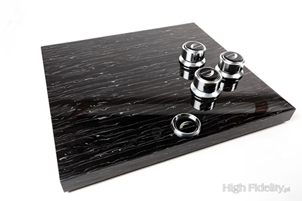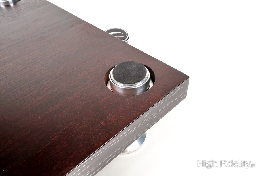 Od początku dobieram materiały z pełną świadomością i bez przypadkowości. Dlaczego aluminium i MDF, a nie stal, drewno czy sklejka? Od dawna myślałem o poszerzeniu oferty o produkty z drewna, ale ciągle nie starczało mi czasu. Sprawa rozwiązała się trochę samoistnie, w momencie, gdy pracowałem nad rozszerzeniem oferty podstawek antywibracyjnych Ceramic Disc i zaprojektowałem nową, o nazwie Ceramic Disc Tablette. Nazwa ni to polska, ni francuska – własna chyba. Podstawki miały być uzupełnieniem wspomnianej oferty, lecz tak mi się spodobały, że zarzuciłem pomysł o nowej linii i postanowiłem je wykorzystywać jako nóżki do platform. Wcześniej w platformach kompozytowych Composite One Slim i Fat również stosowałem nóżki ceramiczne, ale te nowe pozwalają na poziomowanie platform, co wcześniej nie było możliwe i czego, nie ukrywam, ciągle w moich platformach mi brakowało. Miałem nóżki, czas na „deskę”. Wybór materiału nigdy nie jest dla mnie łatwy ani też przypadkowy. Bardzo lubię drewno i sklejkę, lecz wybrałem MDF, ponieważ to materiał o najwyższej powtarzalności struktury wewnętrznej. Nie mówię i nie zapieram się, że nie wykonam kiedyś ustrojów z drewna czy sklejki, i nie mówię, że to złe materiały (prawdę mówiąc, od paru miesięcy sklejka leży sformatowana i czeka na dokończenie platform). Wielu producentów umiejętnie i z wielkim powodzeniem je stosuje, a ich produkty świetnie działają, lecz jak wspomniałem, zależy mi na jak największej powtarzalności (jak we wszystkich produktach), a to – moim zdaniem – zapewnia jedynie MDF. Żeby nie być gołosłownym: gram na bębnach, wiem jak się je produkuje – ze sklejki. Tanie zestawy, takie za ok. 1500 zł, to wygięte korpusy z kilkuwarstwowej, niedrogiej sklejki brzozowej obłożonej okleiną. Wytwarza się je produkując, powiedzmy dla zestawów fusion, korpusy 10”, 12”, 14” i 20”, pakuje w kartony i wysyła do sklepów. Bębny takie brzmią przyzwoicie, ale nie rewelacyjnie. Drogie i bardzo drogie zestawy - takie za kilkanaście czy kilkadziesiąt tysięcy złotych, to znacznie bardziej zaawansowana sprawa. Korpusy wygina się w kadłach, a każda warstwa sklejki jest wkładana w nie jako indywidualny, odpowiednio docięty arkusz. Korpusy takie często wykonuje się, jako mieszane – np. trzy warstwy klonu kanadyjskiego i dwie orzecha amerykańskiego czy bubingi. Każdy z materiałów daje inne efekty dźwiękowe, ich mieszanie również. Po wykonaniu korpusów osłuchuje się je (opukuje) i dopiero wówczas starannie dobiera w zestawy o najbardziej zbliżonej barwie. To trochę tak, jak w naszej branży parowanie kondensatorów, wybieranych spośród paruset sztuk. Po tak starannym doborze powstaje bardzo dobry zestaw. Nie czarujmy się jednak, drewno ma nierównomierną strukturę, każdy jego kawałek jest inny, ma inną gęstość i ułożenie słojów, dlatego nigdy nie będzie dwóch identycznie brzmiących zestawów. Będą one BARDZO zbliżone, ale nie identyczne. I tu dobrnęliśmy do sedna – MDF jest inny, bardzo uporządkowany i powtarzalny i dlatego ten właśnie materiał wybrałem na nowe „drewniane” platformy. Nie jestem oryginalny, bo większość firm go stosuje, ale mój wybór jest świadomy i nieprzypadkowy. Obecnie dostępne są dwa typy platform – testowana Wood Block Slim oraz Wood Block Fat. Nie mówię, że Slim nadaje się tylko do lekkich produktów, gdyż ma ona spory limit ciężkości (max ~40 kg), a Fat tylko do ciężkich, bo często klienci kierują się również wyglądem i chcą mieć bardziej okazały produkt, a Fat taki właśnie jest. Slim jest platformą delikatniejszą i smuklejszą. Obie platformy wyposażone są we wspomniane, nowe nóżki Ceramic Disc Tablette, które pozwalają na ich poziomowanie. Korpusy są toczone z odpowiednich stopów aluminium na obrabiarkach CNC, co gwarantuje ich powtarzalność, a w każdej nóżce znajdują się trzy kulki ze spieków ceramicznych, które stosuję konsekwentnie od samego początku we wszystkich stopach z grupy Ceramic Disc. W testowanej platformie Wood Block Slim każda z czterech nóżek zawieszona jest niezależnie i dodatkowo odsprzęgnięta od „deski”, co pozwala na jej lekkie „bujanie” się na boki. System taki zapewnia lepszą izolację od drgań i rezonansów niż wkręcenie czterech nóżek bezpośrednio w platformę. Platforma Wood Block Fat ma nieco inne zawieszenie – podobne jak platformy kompozytowo-aluminiowe Composite One Slim i Fat. Ale o tym powiem przy ewentualnej okazji testu tej platformy. Platformy dostępne są w wielu kolorach, jako lakierowane z wykończeniem na mat lub wysoki połysk. Do wyboru jest również około 100 różnych fornirów z wykończeniem na mat lub polerowanych ręcznie na wysoki połysk. Standardowy rozmiar to (szer. x gł. x wys.) 480 x 440 x 40 mm, lecz nie ma problemu z przygotowaniem platformy o innych wymiarach. Dodam jeszcze, że w przygotowaniu jest drewniany stolik, w takim wykończeniu, jak testowana platforma, który, jeśli nic nieprzewidzianego się nie wydarzy, zaprezentuję na tegorocznym Audio Show w Warszawie.