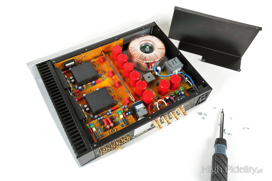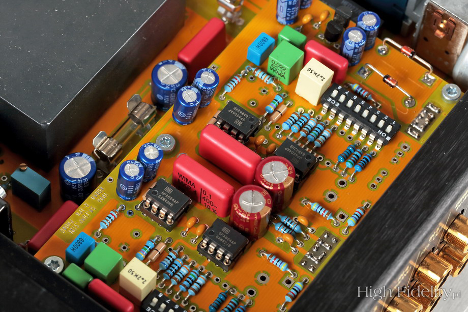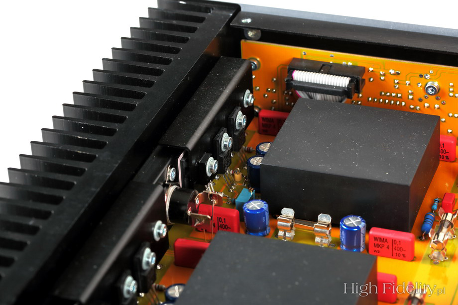 Dźwiękowo Cat’s Dream nie zawodzi. Brzmienie jest gęste i bez cienia wyostrzeń, rozjaśnień. Barwy są ładne, gęste, nieźle różnicowane. Dobrze pokazane są również kształty instrumentów, a ich bryły sensownie zaznaczone. Brzmienie jest dość ciemne i nie jest specjalnie rozdzielcze. Rozumiem to, co zostało osiągnięte, i nie narzekam. Obydwie przywołane płyty, w nowych remasterach, brzmią jednak bardziej plastycznie, mają więcej „oddechu”, bez podkreślania konturów i bez rozjaśniania dźwięku. Na tle współczesnych realizacji, na przykład niedawno wydanej Midnight Melodies Cyrusa Chestnuta (recenzja TUTAJ http://highfidelity.pl/@main-2179&lang= <./a>), płyta Sarneckiego wypada jednak bardzo dobrze. Nawet Night in Calisia Włodka Pawlika, którego słyszałem zresztą w Krakowie, w czasie trasy promującej ten album (już jako posiadacza Grammy), nie brzmi lepiej. Cat’s Dream pod względem dźwięku to dobra, solidna, nieprzekombinowana płyta. Dobrze się jej słucha, ma w sobie coś, co każe do niej wracać, nie jest ani przegadana, ani pusta. To w jazzie wielka sztuka, bo przecież wydaje się, że wszystko już było. Jakość dźwięku: 8/10 ![]() ![]() Włoski wzmacniacz wygląda niezwykle elegancko. Srebrna ścianka przednia, góra i dół, czarny radiator z boku – to wszystko już było. Tutaj jednak poskładane jest w taki sposób, że aż przyjemnie się patrzy. Pośrodku przedniej ścianki mamy gałkę siły głosu. Wygląda jak chromowana. Z większej odległości nie widać jednak, jak mocno jest odkręcona. Obok jest mały, dwufunkcyjny przełącznik. Jeden tryb, przyciśnięcie, to przejście do i od stanu uśpienia, a drugi, przechylenie, to zmiana aktywnego wejścia. O tym, które zostało wybrane, mówią mikrodiody LED o niebieskiej barwie. Układ elektroniczny zmontowano na jednej płytce drukowanej. Firma informuje, że został opracowany pod kątem ekstremalnie szerokiego pasma przenoszenia w taki sposób, jak projektuje się urządzenia przeznaczone do pracy z wysokimi prędkościami przesyłu. Służy temu również przemyślana płytka drukowana, ze złoconymi ścieżkami i punktami lutowniczymi. Wejście przełączane jest w przekaźnikach ze stykami pokrytymi palladem i złotem. Wygląda na to, że na wejściu umieszczono potencjometr, wskazuje na to niska impedancja wejściowa. To stereofoniczny Alps „Blue Velvet”. Umieszczono go tuż przy przekaźnikach, przy tylnej ściance. Jego oś przedłużono do przodu za pomocą metalowego trzpienia. Nad przekaźnikami przykręca się płytkę z opcjonalnym dodatkiem. W testowanym wzmacniaczu był to przedwzmacniacz gramofonowy PH1-REVO. Wygląda on bardzo ładnie, przede wszystkim dzięki znakomitym elementom pasywnym: kondensatorom Wima, różnego typu, dawno niewidzianym przeze mnie kondensatorom Elna Cerafine Red (w czerwonym kolorze) i precyzyjnym opornikom. Układ oparto na czterech wzmacniaczach operacyjnych Burr Brown OPA604, po dwa na kanał. Użytkownik może zmienić impedancję wejściową w czterech krokach: 100 Ω, 500 Ω, 1 kΩ, 47 kΩ. Można też zdefiniować własną wartość, wpinając do układu określony rezystor. Zmienimy również wzmocnienie układu, w sześciu krokach, w zakresie od 34 dB do 52 dB plus jedna wartość zdefiniowana prze użytkownika, także za pomocą opornika. Właściwy wzmacniacz w znacznej części został zamknięty w plastikowych, czarnych puszkach. Na zewnątrz pozostały tylko tranzystory sterujące i końcówki mocy. Te ostatnie to wysokoprądowe MOSFET-y, po dwie pary komplementarne, pracujące w układzie push-pull, w klasie AB. Wszystkie tranzystory są dobierane i parowane tak, aby mierzyły identycznie w lewym i prawym kanale. Również tutaj widać wysokiej klasy elementy bierne. Osobno, pod ekranem, umieszczono układ zasilacza. Jego podstawą jest duży transformator toroidalny, z trzema uzwojeniami wtórnymi, a więc i z trzema osobnymi zasilaczami. Te są niskoszumne, wielokrotnie stabilizowane. W przedwzmacniaczu pracują dwa, a w końcówce mocy sześć ładnych kondensatorów filtrujących tętnienia sieci. Wykonała je firma Itelcond.