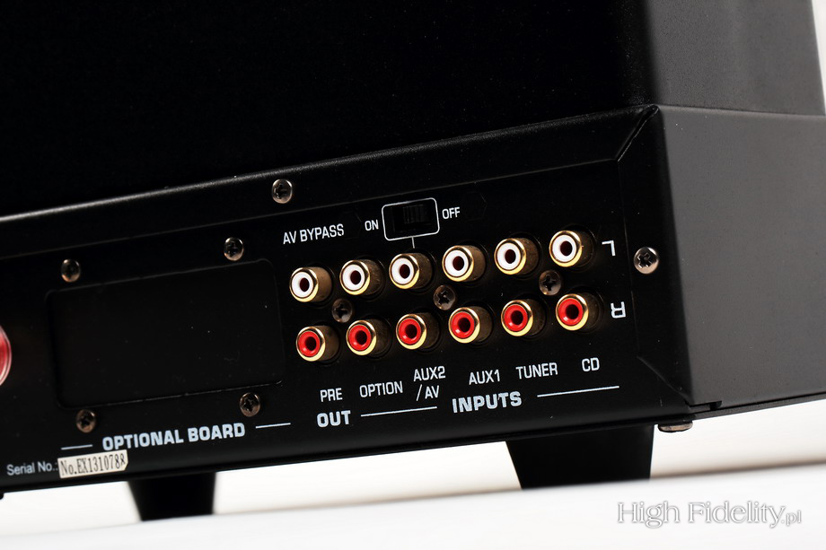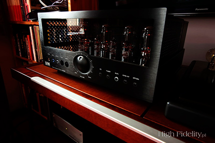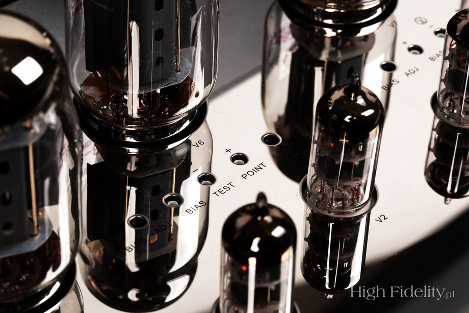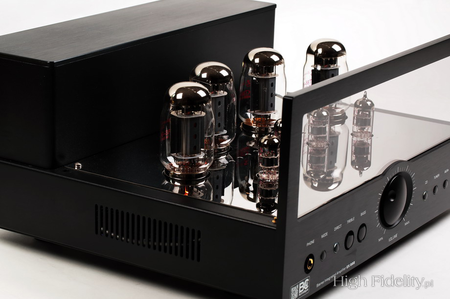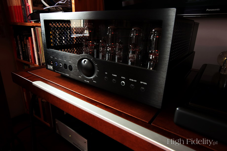 Jakość dźwięku: 7/10 (wokal: 5/10) www.leonardcohen.com www.sonymusic.com![]() ![]() EX-888 jest wzmacniaczem zintegrowanym, lampowym, z zasilaczem półprzewodnikowym. Jego wygląd i konstrukcja przypomina model wypracowany przed wieloma laty, kultywowany następnie z powodzeniem przez niemal wszystkie firmy, które z lampami miały coś wspólnego. Z przodu mamy niską ściankę przednią, na której umieszczono manipulatory, na górnej ściance lampy, a za nimi, zamknięte w osobnej obudowie, transformatory – zasilający i głośnikowe. Postarano się jednak, aby jego użytkowanie było bezpieczne, a przy tym aby wzmacniacz był ładny. Regulacje Unii Europejskiej wymuszają na producentach stosowanie elementów ochronnych, zabezpieczających użytkowników przed poparzeniem. Najczęściej mają one postać metalowych klatek, szczelnie zakrywających górę urządzenia. Pośrodku widać gałkę siły głosu – tutaj jest płaska, w nowszym modelu ‘.1’ ma klasyczny wygląd. Ta tutaj podoba mi się bardziej. Po prawej stronie umieszczono niewielkie przyciski z podświetlanymi na biało obwódkami, służą one do zmiany wejść. Po lewej stronie mamy wysuwane gałeczki do regulacji wysokich i niskich tonów. Sekcję tę można wyłączyć guzikiem obok (rekomendowane). Dalej widać przycisk z obwódką w kolorze niebieskim lub białym, w zależności od tego, jaki tryb pracy wzmacniacza końcowego wybierzemy (odpowiednio): triodowy lub pentodowy (właściwie tetrodowy). I jest jeszcze gniazdo słuchawkowe. Kiedy wepniemy do niego słuchawki, sygnał na wyjściach głośnikowych jest wyciszany. Nie widać nigdzie wyłącznika sieciowego, ponieważ umieszczono go na dolnej ściance, po prawej stronie. Z tyłu widać rządek gniazd RCA i głośnikowych. Pomiędzy nimi mamy zaślepiony otwór na „opcję”. Zakładam, że chodzi o wejście cyfrowe – w czasie testu nie była jeszcze dostępna. Wejść liniowych jest pięć, z czego jedno można ustawić jako wejście na końcówkę mocy. Możemy wówczas wykorzystać EX-888 w systemie kina domowego. Jest też wyjście z przedwzmacniacza, np. dla aktywnego subwoofera. Transformatory głośnikowe mają po dwa odczepy: dla 3 i 6 Ω. Są więc i dwa wyjścia głośnikowe (plus masa) dla każdego kanału. Układ elektroniczny zmontowano na dużej płytce drukowanej, wspomaganej kilkoma mniejszymi. Ścieżki drukowane mają większą niż zazwyczaj grubość. Widać na niej ładne, polipropylenowe kondensatory firmy Solen, z aluminiowymi okładzinami, sprzęgające poszczególne stopnie. Ale nie wszystkie: dwie triody przedwzmacniacza sprzęgnięte są dzięki wtórnikowi anodowemu, a więc bez potrzeby stosowania kondensatora. W przedwzmacniaczu pracują lampy ECC83S firmy JJ Electronic, a w sekcji sterowania lampami mocy i przy odwracaniu fazy ECC82 tej samej firmy. Regulacja siły głosu oparta jest na czarnym potencjometrze Alpsa, z silnikiem sterującym. W końcówce znajdziemy klasyczne tetrody strumieniowe KT88-98, chińskiej firmy Electron Tube. Pracują one w trybie ultraliniowym, push-pull, w klasie AB. Oddają wówczas 40 W na kanał. Można to zmienić, włączając tryb triodowy, wzmacniacz oddaje wówczas 20 W na kanał. Bias lamp końcowych ustawia się ręcznie – służą temu potencjometry i punkty pomiarowe na górnej, wykonanej z polerowanej stalowej blachy, płycie.