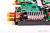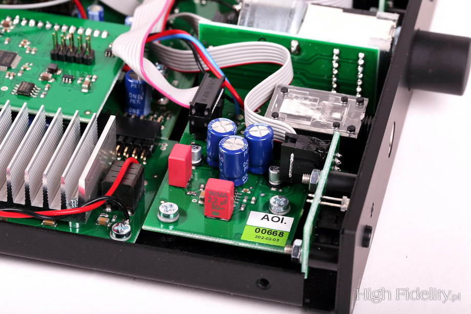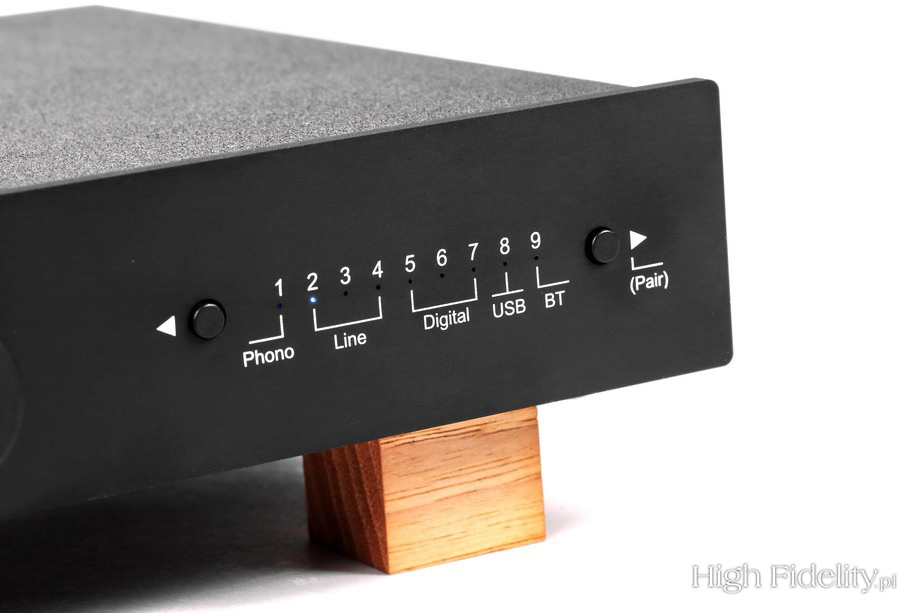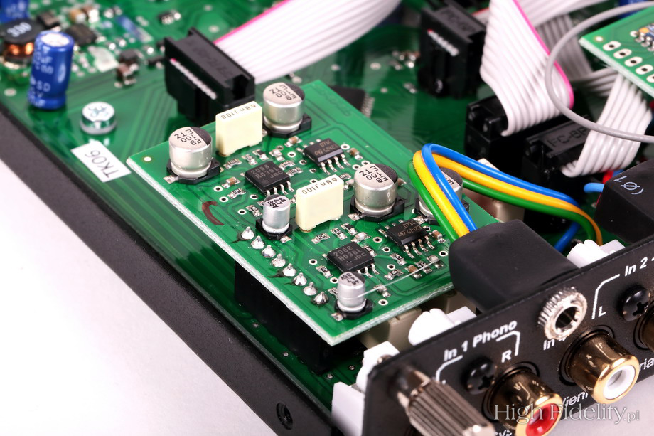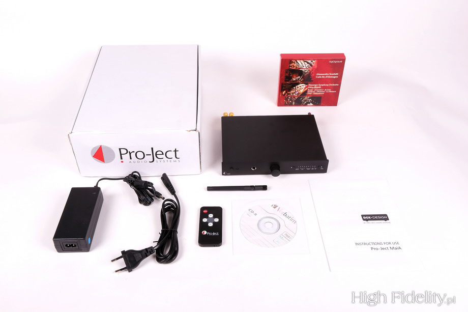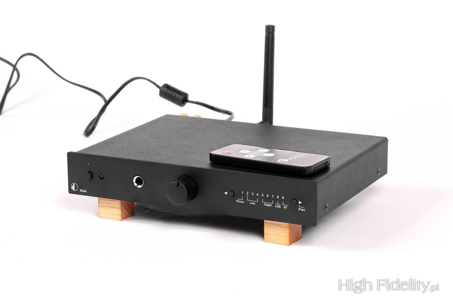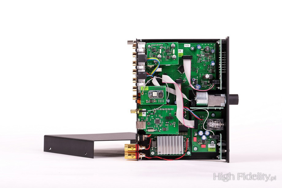 Sprawdzianem, przy którym mogłem przyjrzeć się wzmacniaczowi dokładniej, była właśnie przeze mnie kupiona i przysłana mi przez Andreasa Spreera płyta z Sonatami nr 109, 110 i 111 Ludwiga van Beethovena, w wykonaniu Evgenia Korolova. Andreas nagrał materiał na magnetofonie analogowym w berlińskim kościele Jesus-Christus-Kirche, w którym w zeszłym roku byłem. Korolov gra na potężnym fortepianie Steinway D, a nagranie zostało dokonane w minimalistycznym ustawieniu mikrofonów, bez kompresji. Słychać to momentalnie. Tyle tylko, że – powtórzę – nie przeszkadza to w odbiorze muzyki, w słuchaniu różnych płyt. A jeśli przejdziemy na płyty winylowe, rozpocznie się czarowanie. Nie da się tego inaczej określić, bo przecież takiej dużej zmiany być nie powinno. Dźwięk się dogęścił, muzyka została dopieszczona. Gęstość przekazu wzrosła, podobnie jak trójwymiarowość brył. Wszystko było bardziej namacalne i bardziej selektywne. Dlaczego tak? Nie potrafię powiedzieć, nie powinno tak być, różnice nie powinny być aż tak wielowymiarowe. Podsumowanie Wejścia cyfrowe w MaI są pomocne, rozumiem je jako fajny, funkcjonalny dodatek, coś dodatkowego. Przetwornik cyfrowo-analogowy wewnątrz gra o kilka dB ciszej niż źródła analogowe, przy porównaniach trzeba więc pamiętać o wyrównaniu siły głosu. Jego dźwięk jest trochę zgaszony i jednowymiarowy, przynajmniej w porównaniu z wejściem gramofonowym. Ale takie jest życie. Wyjście słuchawkowe też przyda się okazjonalnie. Jeśli jednak chcemy czegoś bardziej nasyconego, bardziej rozdzielczego, pomyślmy o zewnętrznym wzmacniaczu, chociażby z oferty Pro-Jecta. Najważniejsze jest jednak to, że winyl rządzi, także z MaiĄ. Niedrogie komponenty, z jakimiś fajnymi, raczej ciepłymi (byle nie rozjaśnionymi) kolumnami zagrają niezwykle przyjemnie, przyjaźnie. Uważałbym na komponenty z podniesionym środkiem (odchudzonym niskim jego zakresem), ponieważ grając głośno, wzmacniacz Pro-Jecta też ma takie ciągoty. Z dobrym odtwarzaczem CD też będzie bardzo fajnie, nie narzekałem słuchając wspomnianych płyt, miałem z tego dużą uciechę, dobrze się bawiłem. Polecam. ![]() MaiA jest wzmacniaczem zintegrowanym, do którego zaaplikowano również przetwornik cyfrowo-analogowy i odbiornik Bluetooth. Jest maleńki i wymiarami przypomina niewielką książeczkę. Jego budowa jest jednak solidna – to stalowe, grube blachy i aluminiowy front. Tył jest niezwykle zatłoczony. Ze względu na niski profil urządzenia gniazda stereofoniczne, analogowe, umieszczono poziomo. Mamy dwa wejścia liniowe na RCA i mini-jackach (równolegle), wejście gramofonowe MM oraz cztery wejścia cyfrowe: USB, RCA i dwa optyczne. Dwa pierwsze przyjmują sygnał do 24 bitów i 192 kHz, a Toslink ograniczony jest do 96 kHz. Dzięki odbiornikowi Bluetooth możemy przesyłać sygnał ze smartfona lub tabletu (komputera). Urządzenie ma najnowszy kodek aptX, charakteryzujący się naprawdę wysoką jakością dźwięku. Z boku jest jeszcze gniazdo zasilające 20 V DC i dwie pary gniazd głośnikowych. Te są złocone i całkiem solidne, jednak zupełnie mi tu nie pasują. Są umieszczone tak blisko siebie, że trzeba się wykazać wielką ostrożnością, aby nie zewrzeć wtyków. Gniazda BFA, choć forsowane przez urzędników Unii Europejskiej, a przez to idiotyczne, tutaj sprawdziłyby się idealnie. Zasilaniem zajmuje się niewielki, ścienny zasilacz impulsowy. Równie zatłoczone, jak tył, jest wnętrze wzmacniacza. Widać, że ma ono budowę modułową, ponieważ każda z poszczególnych sekcji ma swoją własną płytkę drukowaną, a te łączone są taśmami komputerowymi. Wzmacniaczy zajmuje jedną z najmniejszych. Pod małym radiatorkiem ukryto konwertery PWM, zintegrowane z tranzystorami mocy. Obok radiatora widać maleńkie cewki z rdzeniami, potrzebne do zamiany sygnału impulsowego na sinusoidę.