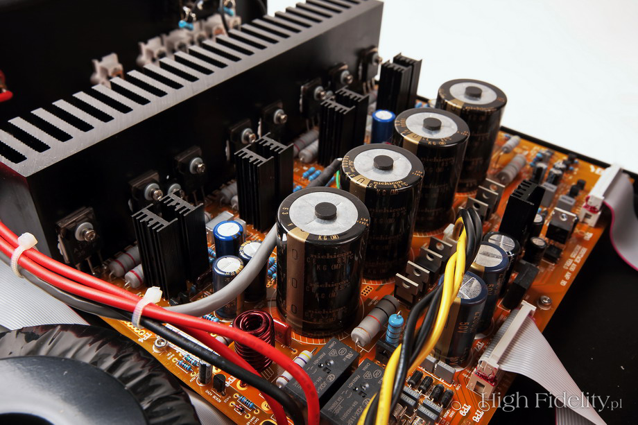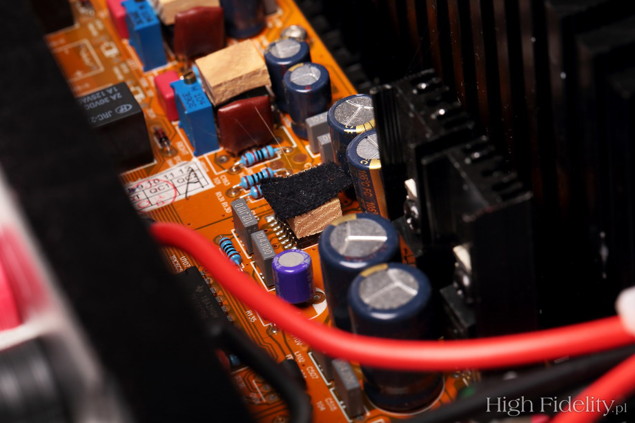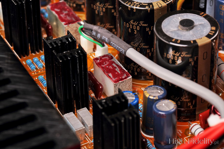 Sygnał po stłumieniu przesyłany jest do większej płytki, po drugiej stronie radiatora i wzmacniany w tranzystorach. Jak się wydaje, przedwzmacniacz i końcówka sprzęgnięte są kondensatorami – zawodowo wyglądającymi elementami, przypominającymi kondensatory foliowe NOS z lat 60. Tranzystory użyte w sekcji wejściowej przykręcono do niewielkich radiatorów, a końcowe, pracujące w push-pullu w klasie AB dwie komplementarne pary Sankena na kanał (2SA1386+2SC3519), do radiatora o którym już mówiliśmy. Na tej samej płytce jest też zasilacz. A właściwie kilka. Osobne uzwojenia wtórne dużego transformatora toroidalnego mają lewy i prawy kanał końcówki mocy, przedwzmacniacz i układy wspomagające (np. wyświetlacz, logika i zabezpieczające). W filtrowaniu napięcia dla końcówek mamy cztery piękne kondensatory Nichicona Fine Gold, na których naklejono niewielkie krążki, wyglądające jakby miały tłumić drgania. ![]() Dane techniczne (wg producenta) Moc wyjściowa: ![]() Dystrybucja w Polsce: ![]() DOŁĄCZ DO NAS NA TWITTERZE: UNIKATOWE ZDJĘCIA, SZYBKIE INFORMACJE, POWIADOMIENIA O NOWOŚCIACH!!! ![]() ![]() |