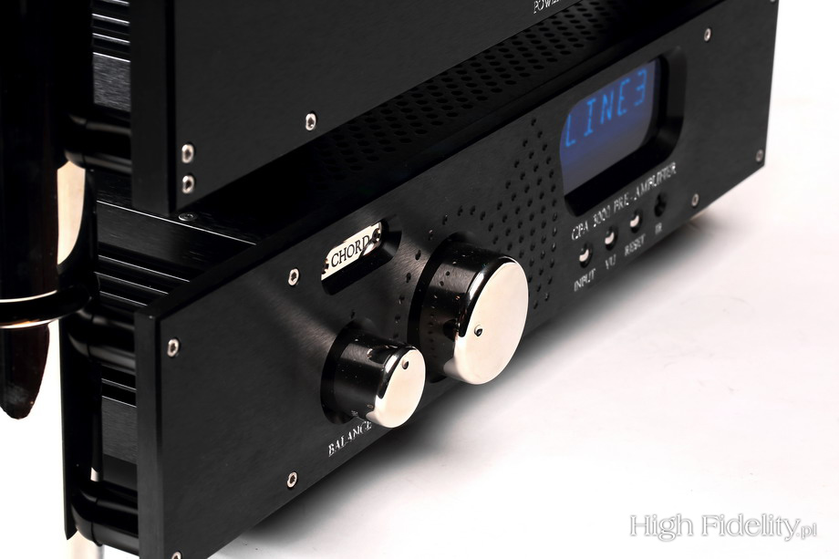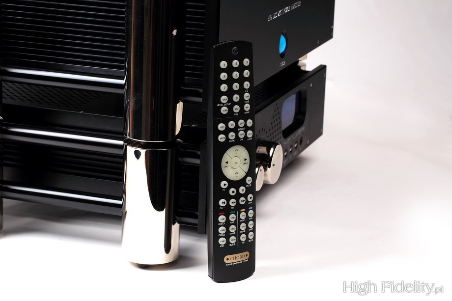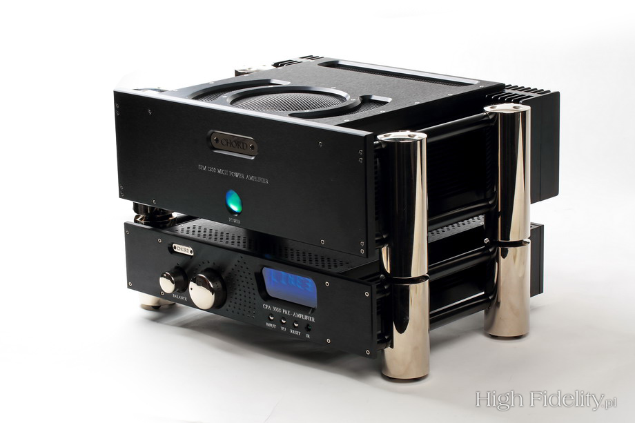 Dynamika jest doskonała, ale najlepiej słuchało mi się niewielkich składów (muzyka dowolna), albo dobrze zrealizowanego rocka z lat 60. i 70. Bardzo, znakomicie brzmiały gitary elektryczne. Miały one swój charakterystyczny „sound”, dobrze pokazana została różnorodność pieców gitarowych i wybranych przez realizatora efektów. Świetnie wypada też elektronika. Wzmacniacz pokazuje jednak wyraźnie kompresję zastosowaną w studiu, dlatego część płyt, które gdzie indziej wydają się dynamiczne, z Chordem zagra dość płasko – tak, jak zostały nagrane. Trudno oczywiście z tego czynić zarzut, ale trzeba być na to przygotowanym. Podsumowanie Rozdział między wzmacniaczami lampowymi i półprzewodnikowymi z roku na rok maleje. Zapewne nigdy nie zniknie, jednak różnice będą coraz mniej znaczące. Każda z tych technik oferuje coraz lepsze rozwiązania, z którymi spokojnie mógłbym żyć, nie oglądając się na to, co „w środku siedzi”. Do perfekcji dochodzą jednak z różnych stron. W lampach, zachowując ich naturalne zalety, jak wypełnienie i organiczność idziemy w kierunku otwarcia, dynamiki w skali makro i różnicowania. Tranzystory, zachowując definicję i dynamikę (o kontroli basu nie wspominam, bo to chyba jasne), mają coraz lepsze wypełnienie i organiczność. System Chorda łączy te obydwie tendencje w wyjątkowo ujmujący sposób. To gęste, naturalne granie, w którym mamy mnóstwo informacji o instrumentach, nagraniu, a także systemie, w którym pracuje. Trzeba mu zapewnić odpowiednie warunki pracy, tj. wysokiej klasy kolumny, źródło, kable, kontrolę wibracji – bez tego nie będzie szczęśliwy na tyle, żeby się nam szczęściem odwdzięczyć. U polskiego dystrybutora znajdziemy odpowiednie kolumny, ale spróbujmy posłuchać Chorda z Harbethami, Spendorami, JBL-ami, Tannoyami ze starej szkoły, a zobaczymy nowy, lepszy świat. Naturalny i na wyciągnięcie ręki. I tylko nasz. System sprawdzi się w domowych warunkach genialnie, ale nie tylko tam – gdyby tylko studia nagraniowe wyposażone były w takie urządzenia, wszyscy bylibyśmy szczęśliwsi. To jedna z niewielu marek, które z czystym sumieniem poleciłbym nie tylko audiofilom, melomanom, ale również profesjonalistom, ze świadomością tego, że za dziesięć lat wzmacniacz wciąż będzie działał i że w tym czasie jego dźwięk się nie zmieni. ![]() Urządzenia Chorda mają przemyślaną pod każdym względem budowę mechaniczną, stanowiącą całość z elektroniką. Choć wydaje się, że to zwykłe „czarne skrzynki” to tak nie jest. Od strony mechanicznej wygląda to w ten sposób, że właściwa obudowa z układami jest zawieszona na czymś w rodzaju stelaża. Składa się on z czterech grubych pilarów, łączących je poprzeczek oraz przedniej i tylnej ścianki z grubego aluminium. Pilary są wyprofilowane od góry tak, że można stawiać poszczególne urządzenia jedne na drugich – powstaje wówczas coś w rodzaju antyrezonansowego stolika z zawieszonymi na nim urządzeniami. Ale też nic nie stoi na przeszkodzie, aby urządzenia stały na osobnych półkach stolika, jak to miało miejsce u mnie. Budowa obydwu urządzeń, ich wykonanie, smaczki designerskie – wszystko to jest wzorcowe. To, jak dla mnie, równorzędny partner dla japońskiego Accuphase’a, z tym że Japończycy nawiązują do lat 70., a Chord do nowoczesności. Przedwzmacniacz CPA 3000 Najważniejszym elementem przedniej ścianki przedwzmacniacz jest duży wyświetlacz alfanumeryczny z niebieskim filtrem. Z daleka można na nim odczytać siłę głosu, wybrane wejście i elementy menu. To wywołujemy albo z przedniej ścianki, małym chromowanym guziczkiem, albo z pilota. Pilot zdalnego sterowania to bardzo dobra, sprawdzona konstrukcja, wprowadzona niegdyś przez Arcama, a teraz używana przez wiele firm, np. Cyrusa. Pilotem, oprócz menu, zmienimy także siłę głosu i balans między kanałami oraz wybierzemy wejście AV Bypass. Można do niego podpiąć zewnętrzny procesor kina domowego, włączając Chorda w system wielokanałowy. Siłą głosu i balansem sterujemy również gałkami na przedniej ściance, a zmianą wejść chromowanym guzikiem. Tylna ścianka pokazuje, że to układ zbalansowany – wejścia i wyjścia XLR są tutaj najważniejsze. Cztery pierwsze wejścia to XLR-y i jedynie dwa kolejne to RCA. Pętla do nagrywania – wejście i wyjście – jest niezbalansowana, ale już wejście omijające regulację siły głosu (gain = 1) jest zbalansowane. Wyjścia z przedwzmacniacza są w formie XLR i RCA. Gniazdo zasilające IEC sprzężone jest z mechanicznym wyłącznikiem. I są jeszcze gniazda trigger ora zacisk uziemienia. Układ wzmacniający oparto na układach scalonych, a wejście przełączane jest w przekaźnikach. Zasilacz to oczywiście układ impulsowy, z wieloma stabilizatorami napięcia tuż przy zasilających je układach. Widać również kilka stopni filtracji napięcia przed zasilaczem – chodzi o to, aby szumy generowane przez takie układy nie wydostawały się na zewnątrz, do sieci, i nie zakłócały pracy innych urządzeń w systemie. Wzmacniacz mocy SPM 1200 MkII Wzmacniacz jest ciężki, pomimo że jego zasilacz, zwykle najcięższy element urządzenia, jest lekki – to zasilacz impulsowy. Wiele mówi to o solidności obudowy. Na przedniej ściance, oprócz metalowej plakietki z logiem firmy, jest duża zatopiona do połowy kulka, którą włączamy zasilanie. Jeśli wzmacniacz wpięty jest do sieci, świeci ona na czerwono. Po naciśnięciu na jakiś czas zmienia kolor na zielony, by przejść na kolor niebieski – oznacza to, że możemy zacząć grać muzykę. W tym samym czasie rozbłyskają diody LED oświetlające wnętrze – zielone i niebieskie. Daje to sporo światła – LED-y widać przez ażurową ściankę górną. Prawdę mówiąc, choć sporo tego oświetlenia, wygląda to super! Tylna ścianka zajęta jest