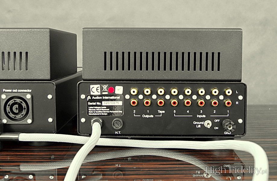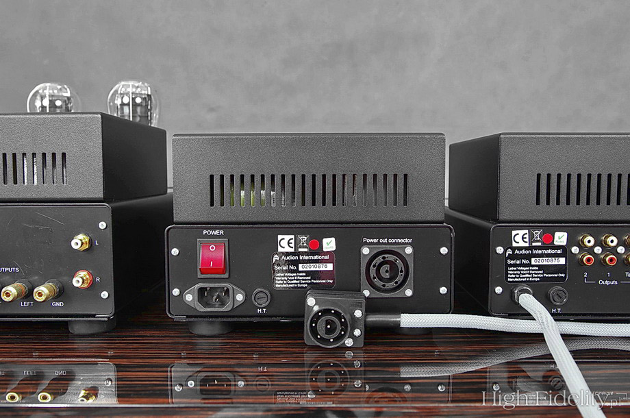 Na froncie, pośrodku, znajduje się więc spora, srebrna gałka regulacji głośności. Po prawej stronie umieszczono białe, firmowe logo z ładnie wkomponowaną, niezbyt intensywnie świecącą niebieską diodą sygnalizująca pracę urządzenia. Na tylnej ściance umieszczono gniazdo zasilania, duży, podświetlany na czerwono włącznik urządzenia, przełącznik uziemienia (używany w przypadku problemów z pętla masy), dwie pary pozłacanych gniazd głośnikowych, oraz jedno wejście liniowe (RCA). Standardowo wzmacniacz przystosowany jest do współpracy z kolumnami 8 Ω, ale trafa wyposażone są również w odczepy 4 Ω (zmiana wymaga ingerencji wewnątrz wzmacniacza). Audion Premier 2.0 Line/Phono Plus Audion Premier 2.0 Line/Phono Plus to z kolei przedwzmacniacz z wbudowanym przedwzmacniaczem gramofonowym dla wkładek MM. W wersji tej zasilanie wydzielono do osobnej obudowy. Oba elementy przedwzmacniacza umieszczono w obudowach wzorniczo, kolorystycznie i rozmiarowo dopasowanych do wzmacniacza. Co istotne – obudowę zasilacza wykonano w takim samym standardzie, dzięki czemu nie trzeba jej ukrywać za stolikiem – może stać dumnie obok samego urządzenia. W urządzeniu pracują dwie pary rosyjskich lamp – NOS-y 6H1N-EB oraz 6H23N. Urządzenie wyposażono w 1 wejście phono, oraz 4 wejścia liniowe (RCA). Na froncie znajduje się 5 niewielkich przełączników hebelkowych. Wejście oznaczone nr 1 to wejście phono i by je wybrać należy przełączyć pierwszy „hebelek” od lewej, by wybrać wejście nr 2 należy przełączyć dwa pierwsze hebelki od lewej, itd. Po lewej stronie umieszczono niewielkie pokrętło głośności, po prawej identyczne jak we wzmacniaczu logo z niebieska diodą. Na tylnej ściance umieszczono 5 wejść liniowych (w tym jedno phono MM), wyjście dla pętli magnetofonowej, oraz dwa wyjścia dla końcówek mocy. Poniżej umieszczono przełącznik uziemienia, oraz zacisk uziemienia. Po lewej stronie, obok bezpiecznika, umieszczono zamontowany na stałe kabel zasilania zakończony wtykiem pasującym do gniazda zasilania w osobnym zasilaczu. Tył tego ostatniego wyposażono jedynie w czerwono podświetlany włącznik, gniazdo IEC oraz gniazdo zasilające dla przedwzmacniacza. ![]() Dane techniczne (wg producenta) Audion Silver Night Stereo PX 25 Anniversary (HR) Dystrybucja w Polsce: ![]() DOŁĄCZ DO NAS NA TWITTERZE: UNIKATOWE ZDJĘCIA, SZYBKIE INFORMACJE, POWIADOMIENIA O NOWOŚCIACH!!! ![]() ![]() |
