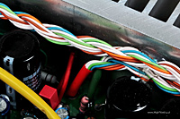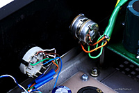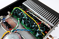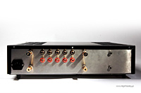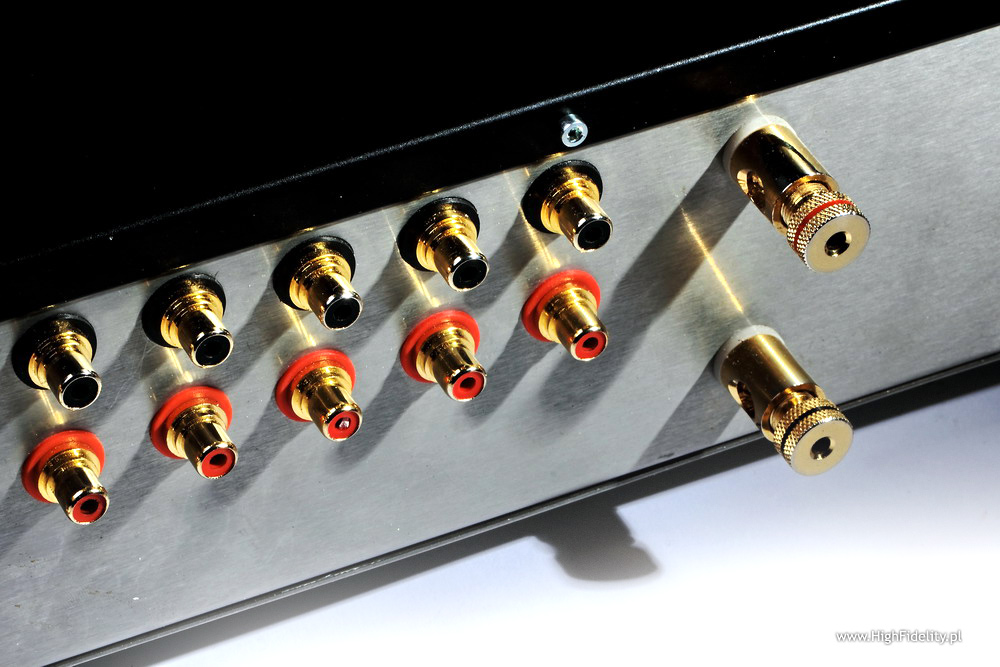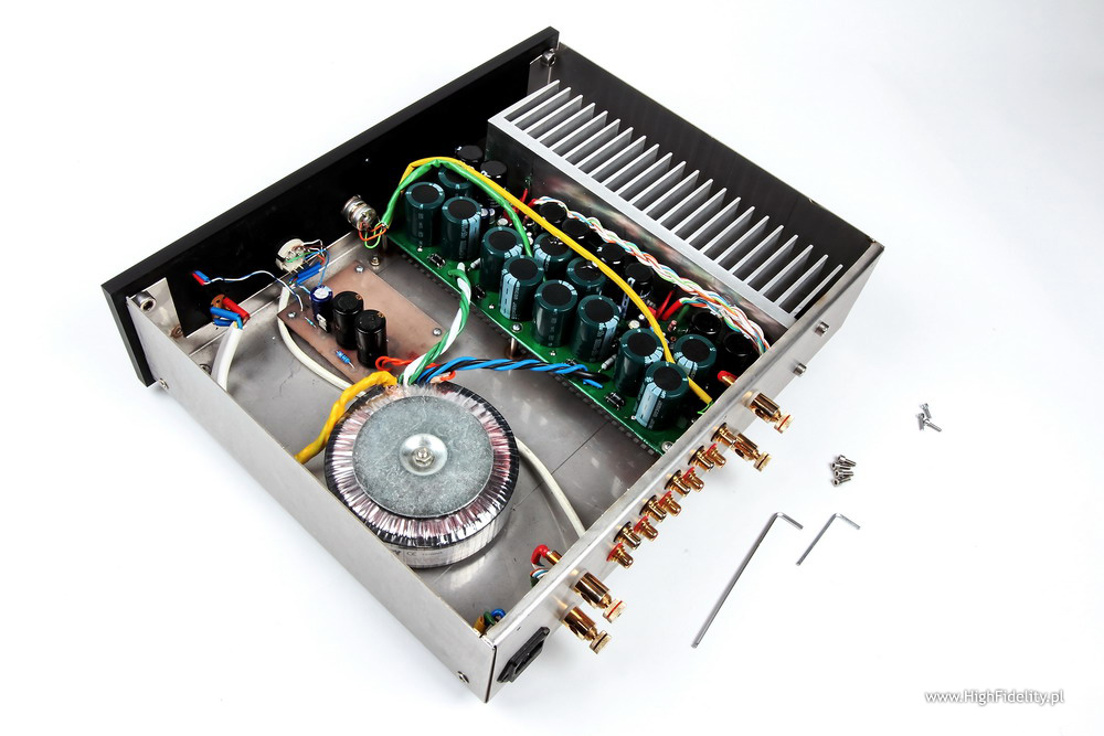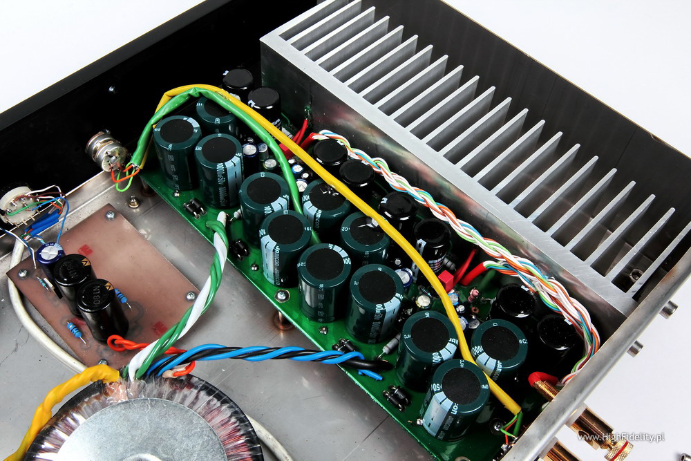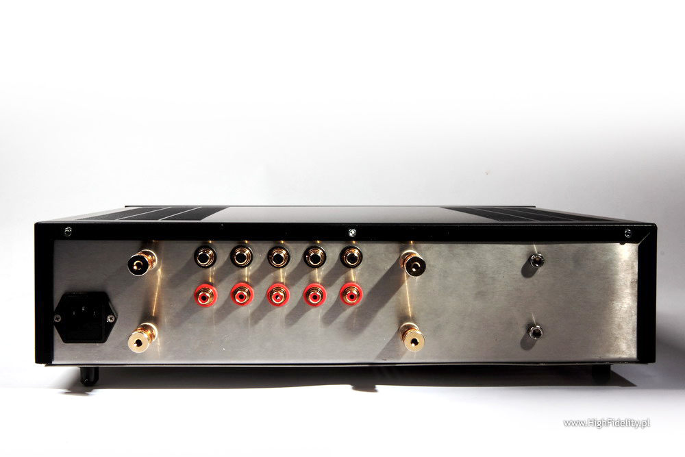 From the design point of view what we have here is a power amplifier equipped with a passive attenuator on the input. That is why the name “electro acoustic power amplifier” used by the designer is not without sense. This is of course an ‘integrated amplifier’, but ‘power amplifier’ is also a good choice. The device is quite heavy. The bulk of this weight is a very large toroidal transformer and a steel enclosure. The enclosure looks like home made in a small workshop. Only the front looks professionally – it is made of black anodized aluminum with laser cut silver descriptions for the knobs. There are tree knobs – power switch, input selector and volume. On the back we have gold plated, big, but not outstanding speaker terminals, the IEC power socket and five pairs of RCA sockets, also quite ordinary. The amplifier does not have a remote controller. The top and side covers are pierced and quite thin.The electronic circuitry is mounted on one big PCB. Voltage filtering capacitors abound everywhere, including the RIFA capacitors just next to the power transistors. The transistors working in AB class, in push-pull are bolted to a large, aluminum heat sink. The potentiometer is open and does not look very impressive. The signal leading to it and then back to the power stage is transferred using thick, shielded cables, looking similar to the ones used by Manley. There are no capacitors in the sound path.