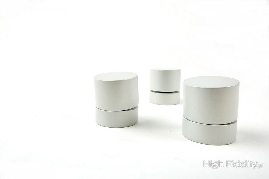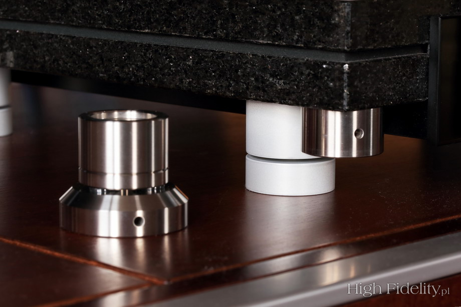 Podstawki Symposium Tungsten Superballs Double Stack Kit W podstawkach amerykańskiego Symposium pomiędzy dwa niezależne, poruszające się osobno elementy wkładana jest kulka – do wyboru mamy kilka materiałów, w „High Fidelity” testowaliśmy wersję z kulką z tungstenu (czytaj TUTAJ). W stopach Franca mamy dwa poziomy odsprzegnięcia – dolny, z trzema ceramicznymi kulkami umieszczonymi we frezach oraz górny, z dużą kulką ceramiczną, przytrzymywaną przez metalowy element. Podobnie zbudowane są nóżki niemieckiej Finite Elemente, ale tutaj ilość kulek, w zależności od modelu, waha się pomiędzy jedną i trzema. We wszystkich tych produktach na kulki działa nacisk z góry.