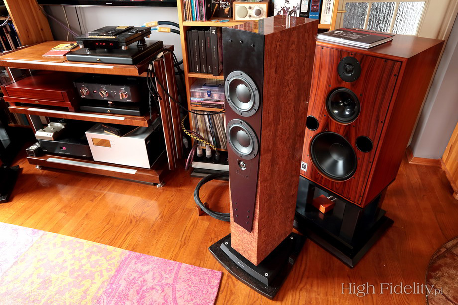 Różnicę zaznaczono także w wyglądzie zewnętrznym, co pokazaliśmy na przykładzie modelu S 1.4 LE. W nowych kolumnach płyta, na której montowane są głośniki wykończona jest na matowo czarny kolor, poza wersją Piano Lacquer, w której wykonana jest z nierdzewnej stali. Choć naprawdę duży, model S 3.4 LE jest kolumną dwudrożną. Zbudowano go przy użyciu trzech głośników – dwóch nisko-średniotonowych po 170 mm każdy i miękkiej kopułki o średnicy 28 mm. Podział między nimi ustalono na 2000 Hz. Konfiguracja głośników jest nietypowa, chyba że mówimy o Dynaudio, dla której to akurat normalne – duże głośniki są na górze, a mały na dole. Znana np. z jej modelu Consequence, a niegdyś z kolumn Castle w serii Inversion, służy fazowemu dopasowaniu głośników i zwrotnicy. Uboczną zaletą jest odsunięcie głośników niskotonowych od podłogi, a tym samym zmniejszenie podbicia części basu. Piękna okleina, wyjątkowa uwaga zwrócona na detale, ładny cokół, taki jak w seriach Confidence i Evidence – to elementy, które od razu przykuwają uwagę. Nie da się koło tych kolumn przejść obojętnie. SETUP Kolumny Dynaudio stanęły dokładnie w tym samym miejscu, w którym na co dzień stoją Harbethy M40.1. Konstrukcje z wąską ścianką przednią zyskują zwykle po ich mocniejszym skręceniu do środka, nawet wtedy, kiedy ich osie przecinają się 50 cm przed moją głową. S 3.4 LE inaczej – najlepiej grały dokładnie tak samo, jak Harbethy, tj. skierowane bezpośrednio na mnie. Ich ustawienie w pokoju nie jest problematyczne. Dopiero, kiedy bas na samym dole zrobi się trochę zbyt mało rozdzielczy, warto pomyśleć o piankowych zatyczkach dla bas-refleksu, o odsunięciu ich od tylnej ściany (lub bocznych), albo o wytłumieniu ściany za nimi książkami, czasopismami lub/i płytami. Podpięcie kabli głośnikowych nie nastręcza żadnych problemów, ponieważ gniazda są przy samej podłodze. Przeszkodą będzie to jedynie w przypadku stosowania wtyków widłowych – w tym przypadku banany to de rigueur. Kolumny stawia się na kolcach, które nie są zbyt łatwe w dokręceniu, dlatego lepiej robić to w dwie osoby. W czasie testu stały na dostarczonych przez dystrybutora granitowych podstawkach, jednak już wkrótce staną na fantastycznych podstawach, w których wykorzystano minerały, dostępnych u tylko u polskiego dystrybutora. Kolumny są wymagające jeśli chodzi o wzmacniacz. Nie pogardzą niewielkim wzmacniaczem lampowym, ale to nie jest otoczenie, z którym współpracują najlepiej. Duży, wydajny prądowo tranzystor, albo naprawdę mocne lampy to konieczność. ![]() Płyty użyte do odsłuchu (wybór):