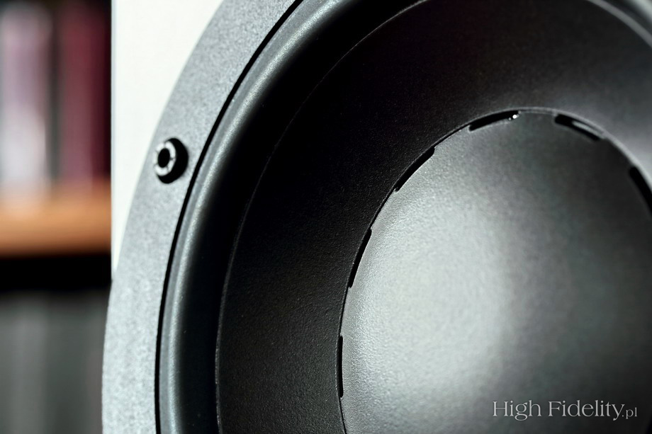 Należący do serii Contour model S 3.4 LE ma budowę dwudrożną, trzygłośnikową, w obudowie typu bas-refleks. Zastosowano w nim dwa, pracujące wspólnie głośniki nisko-średniotonowe o średnicy fi 170 mm każdy, oraz 28 mm kopułkę, odtwarzającą wysokie tony. Te pierwsze mają bardzo solidny, odlewany kosz i membranę tłokową wykonaną z modyfikowanego polimeru MSP (Magnesium Silicate Polymer). To wizytówka firmy od lat, taka sama, jak to, że membrana produkowana jest razem z nakładką przeciwpyłową o specyficznych nacięciach dookoła niej, z jednego kawałka tego materiału. Ich aluminiowa cewka, o bardzo dużej średnicy 75 mm (kolejny wyróżnik Dynaudio), nawinięta jest na kaptonowym karkasie. Kopułka wysokotonowa ma membranę z jedwabiu – to nowa odmiana znanego przetwornika Esotar2. Pokryto ją materiałem tłumiącym rezonanse – proces ten nazwano Precision Coating. Skutkuje on bardziej regularną powierzchnią kopułki. Połączenia wewnętrzne poprowadzono kablami OFC. Wylot bas-refleksu znajduje się na tylnej ściance i ma duży przekrój. W komplecie dostajemy piankowe zatyczki redukujące jego pracę – kolejna rzecz stosowana przez Dynaudio od lat. Obudowę wykonano z 20 mm płyt MDF, okleinowanych bardzo ładnym, naturalnym fornirem. Front usztywniony został grubą płytą z aluminium, oddzieloną od właściwej obudowy materiałem tłumiącym wibracje. Duży cokół stabilizujący to kombinacja dwóch rodzajów płyt – MDF i LFD. Polakierowany został na czarno, a od spodu wkręcamy do niego kolce. Jest on oddzielony od obudowy czymś w rodzaju „mostu”, przewężenia, w którym umieszczono zwrotnicę 1. rzędu (6 dB/okt.) z ładnymi elementami biernymi. To np. kondensatory Mundorfa i świetne oporniki, w tym Thin Film Ceramic Resistor. Pojedyncze zaciski głośnikowe umieszczone są właśnie tam, wychodząc niemal wprost ze zwrotnicy (chodziło o skrócenie ścieżki sygnału). Przypomnijmy, że firma ta konsekwentnie odmawiała umieszczania w swoich kolumnach zacisków do bi- lub tri-wire, twierdząc, że w ten sposób „rozstrajamy” pracę zwrotnicy, przenosząc punkt łączenia masy poza nią.
