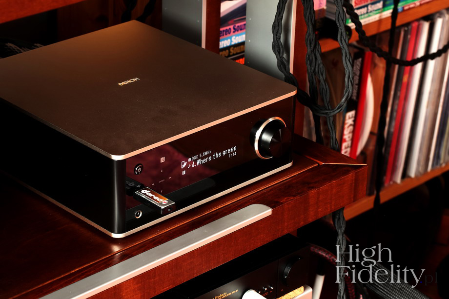 Stojąc na stanowisku fundamentalistycznym, nie udało się jednak zachować tego, co w latach 70. i 80. XX wieku wypracowały dla nas duże japońskie korporacje – ich wzmacniacze były bardzo przyjazne użytkownikowi i jego otoczeniu, nie były tylko „czarnymi skrzynkami” z wejściem i wyjściem. Tę nową falę przyjąłem więc ze spokojem i z uznaniem. Pojawienie się wzmacniacza zintegrowanego Devialet, a potem systemu all-in-one Mu-so firmy Naim, było zwrotem w dobrym kierunku. Oceniając Mu-so dla magazynu „Audio” pisałem, że jeśli tak ma wyglądać przyszłość, to w to wchodzę – i dokładnie to miałem na myśli. Testowane urządzenie Denona jest więc dla mnie objawem zdrowia naszej branży. Wyglądające jak wyrośnięty brat, wyróżnionego przez nas Nagrodą Roku 2015 wzmacniacza PMA-50, urządzenie jest nie tylko jego rozwinięciem, ale czymś więcej. Pamiętają państwo model M1 Lumïna? Denon oferuje dokładnie takie samo połączenie źródła dźwięku i jego wzmocnienia; jest odtwarzaczem plików (streamerem) oraz wzmacniaczem zintegrowanym z wejściami cyfrowymi. Wygląd i funkcjonalność Firmowa nazwa DRA-100 brzmi: Network Stereo Receiver. Być może z tego względu w polskiej wersji instrukcji mówi się o „amplitunerze”. Co miałoby nawet sens – ostatecznie to wzmacniacz z radiem internetowym. Choć większy niż PMA-50, jest wciąż stosunkowo niewielkim urządzeniem. Wizualnie sprawdza się doskonale – to czarna bryła akrylu zamknięta między dwoma płatami piaskowanego aluminium. Funkcjonalność urządzenia jest niezwykle wysoka, chociaż na pierwszy rzut oka tego nie widać. Jego obsługa jest bardzo łatwa, niemal intuicyjna. Można skorzystać z dostarczanej na płycie CD-ROM instrukcji obsługi, ale nawet bez niej po kilkunastu minutach możemy odtwarzać muzykę. Sterowanie odbywa się albo z przedniego panelu, gdzie mamy podświetlane, dotykowe przyciski i wyświetlacz OLED, a także gałkę siły głosu, albo z pilota zdalnego sterowania, albo wreszcie aplikacji Denona na urządzenia iOS oraz Android. Przy setupie skorzystałem tylko z tego pierwszego, to naprawdę proste. DRA-100 jest odtwarzaczem plików. Sygnał doprowadzamy do wejścia ethernetowego, kompatybilnego z protokołem DLNA 1.5, albo do wejścia USB-A (płaskiego) na przedniej ściance (uwaga: pendrajw lub dysk zewnętrzny USB musi być sformatowany w formacie FAT16 lub FAT32, inaczej sekcja streamera zawiesi się i trzeba je wyłączać z sieci, aby „odwiesić”). Za ich pomocą można odtwarzać szeroką gamę formatów, aż do DSD128, FLAC 192/24, ALAC 96/24, WAV 192/24 oraz AIFF 192/24, o mp3 nie wspominając. Żeby jednak przesłać sygnał DSD z dysku NAS, musi być on, jak i router, odpowiednio skonfigurowany. Sekcja ta pozwala też na odtwarzanie stacji radia internetowego (iTuner) i muzyki z platformy Spotify (po wykupieniu abonamentu). Połączenie z routerem można wykonać za pomocą kabla (rekomendowane) lub bezprzewodowo Wi-Fi. Jeśli chcielibyśmy poprawić jakość dźwięku z odtwarzacza Blu-ray, konsoli do gier lub tunera satelitarnego (kablowego), nie będzie z tym żadnych problemów, Denona wyposażono w zestaw wejść cyfrowych: dwa optyczne i jedno koaksjalne. Sygnał prześlemy również bezprzewodowo, przez łącze Bluetooth lub Wi-Fi (AirPlay). Ze wszystkich tych źródeł sygnał zostanie w Denonie odpowiednio przygotowany – zajmuje się tym układ Advanced AL32. Zamienia on sygnał 16-bitowy na 32-bitowy, korzystając z wyrafinowanego układu interpolacyjnego, będącego pomysłem tej firmy i udoskonalanego od wielu lat. DRA-100 jest niewielkim urządzeniem, a mimo to dostarcza całkiem sporą moc: 2 x 35 W przy 8 Ω i podwaja ją przy 4 Ω. Zawdzięcza to wzmacniaczom mocy pracującym w klasie D, czyli zamieniającym ponad 90% pobieranej mocy w moc wyjściową i przez to generującym niewiele ciepła. System może więc stać w ciasnej półce, bez przepływu powietrza i nic mu się nie stanie. W tym przypadku sięgnięto po wzmacniacze cyfrowe w klasie D, choć na rynku dominują wzmacniacze analogowe tego typu. Rozwiązanie zaproponowane przez firmę CSR (kość CSR A6601A01 1343), pozwala na przesył sygnału cyfrowego od źródła do wyjścia wzmacniacza. Wzmacniacze pracują w opatentowanej przez CSR technologii DDFA (Direct Digital Feedback Amplifier). Umieszczony przed nim układ ponownie taktuje sygnał wejściowy, minimalizując jitter. Rozwiązanie to nazwano Denon Master Clock. W sekcji tej pracują dwa osobne zegary, dla rodzin 44,1 oraz 48 kHz. Sygnał DSD musi być wcześniej zamieniony na PCM, a sygnał analogowy z wejść tego typu (dwie pary na gniazdach RCA) na sygnał cyfrowy. Jeśli więc chcemy posłuchać płyt winylowych, trzeba kupić przedwzmacniacz gramofonowy i wszystko będzie OK. Pamiętajmy tylko, powtórzę, że sygnał analogowy jest zamieniany na cyfrowy. Firma podaje dla niego pasmo przenoszenia w zakresie od 20 Hz do 96 kHz, z czego wynika, że jest zamieniany na sygnał o częstotliwości próbkowania 192 kHz, co jest dobrą informacją. Firma CSR dostarczyła również układ odbiornika Bluetooth. Ciekawe, ale nie zastosowano w tym przypadku kodeku aptX, umożliwiającego przesył sygnału o jakości zbliżonej do CD. Jest za to technologia szybkiego parowania urządzeń NFC (Near Field Communications). Setup Denona podłączamy kablami głośnikowymi do kolumn, a kablem sieciowym do sieci. Warto zwrócić na nie uwagę, ponieważ odpłaci się dobrym dźwiękiem. W teście użyłem referencyjnych kabli z Systemu A/II: Tellurium Q Ultra Silver. W realnym życiu kable Chorda, Oyaide lub nawet niezwykle przystępne cenowo Melodiki będą w sam raz. Warto też wypróbować jakieś gustowne nóżki antywibracyjne pod urządzeniem. Nie dajmy się zwieść i nie oszczędzajmy na kablu ethernetowym – inżynierska, książkowa wiedza mija się tu z wiedzą wynikającą z odsłuchów. W teście 