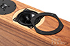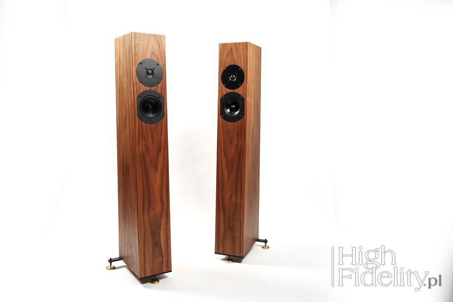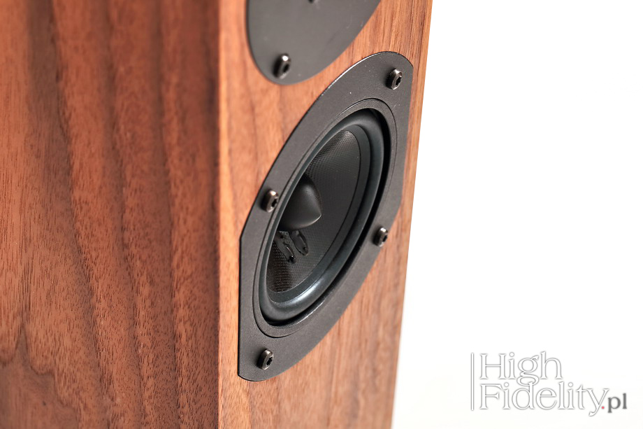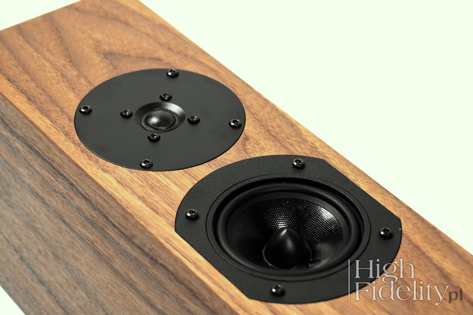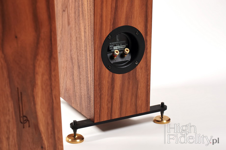 Naturalną koleją rzeczy Blumenhofery lepiej sprawdzą się więc z nagraniami naturalnych instrumentów – jazzu, klasyki, także bluesa. To z nimi kolumny dostarczą najwięcej radości i zabawy. Elektronika, rock, rap itp. zagrają ciekawie, bo z drivem, ale zabraknie w nich „gruntu”, na których mogłyby się oprzeć. Brzmienie nie jest przez to gęste i namacalne, jest szybkie i punktowe. ![]() Fun 10 firmy Blumenhofer wyglądają zupełnie „normalnie”. To dwudrożne kolumny wolnostojące, w naturalnej okleinie. Pochylona przednia ścianka trochę od normy odbiega, podobnie jak trzy, a nie cztery kolce (jeden z przodu, dwa z tyłu), ale dopiero bliższe przyjrzenie się głośnikowi nisko-średniotonowemu wytrąca z błogiej nieświadomości. Tak mały głośnik w tak dużej obudowie? A gdzie głośnik niskotonowy – w środku? Okazuje się, że nie ma więcej głośników, a firma uważa, że układ dwudrożny jest najlepszym z możliwych. Dlatego ten ostatni obciążony jest ćwierćfalową tubą z wylotem od spodu. Głośnik ma wytłaczany z blachy kosz, który jest maskowany szerokim, metalowym kołnierzem, ale mierzy zaledwie 100 mm. Ma dość głęboki profil membrany, wykonanej z powlekanego papieru, z dość dużym, polipropylenowym stożkiem pośrodku. Jest on cięty od góry dość wysoko, bo przy 3 kHz. Jego rozmiary to umożliwiają, bo przy skraju pasma przenoszenia nie jest równie kierunkowy, jak duże głośniki. Mniej pracy ma więc niewielka, 19 mm kopułka z jedwabiu. Ma ona bardzo duży, sztywny front i mocny magnes. Głośniki budują dla Blumenhofera dwie firmy: ATE z Ulm oraz Ehman and Partner z Gundelsheim, każda specjalizując się innych elementach ich konstrukcji. W serii Fun sięgnięto jednak po inne przetworniki. W Fun 10 głośnik nisko-średniotonowy 4 L 1 SL wyprodukowała włoska firma Sica. Ma on maleńki magnes neodymowy. Z kolei kopułkę wysokotonową dostarczyła niemiecka firma Eton, to model 19 SD 1, z bardzo dużym magnesem ferrytowym. Zwrotnicę zmontowano bezpośrednio, bez płytki drukowane. Znajdziemy w niej elementy Intertechnika – cewki powietrzne oraz kondensatory Audyn MKT. Obudowę wykonano z 19 mm płyt MDF i pokryto naturalnym fornirem; na przedniej ściance, blisko podłogi, wyfrezowano logo firmy, co wygląda niezwykle elegancko. Forniry dostępne od ręki to wiśnia i orzech. W tej samej cenie, na zamówienie, otrzymamy klon i brzozę. Jeśli chcielibyśmy inne wykończenie – też jest to możliwe, tyle że będziemy musieli dopłacić: 1260 zł do zebrano, dębu oraz selekcjonowanych fornirów standardowych i aż 2520 zł do drogich fornirów „premium”: jabłoń, oliwka, forniry afrykańskie. Trzeba będzie na nie poczekać dłużej niż na standardowe. I bardzo dobrze, że mamy wybór, to jest to, co nadaje smak każdemu zajęciu. Ale, muszę powiedzieć, że nawet w podstawowym wykończeniu, z jakim kolumny były testowane, tj. w orzechu włoskim (niem. nussbaum) wyglądają bardzo dobrze. Jak wspomniałem, stoją na trzech kolcach – jednym z przodu o dwóch z tyłu. Od dołu obudowa jest otwarta, jest tam wylot tuby, więc wysokość kolców ustala też w pewnej mierze ilość basu. Ponieważ nie ma dolnej ścianki, kolce wkręca się w stalowe płaskowniki (bardzo podobne stosowała kiedyś firma Harpia Acoustics). Ten z przodu licuje się ze ścianką przednią, z ten z tyłu wychodzi poza jej obrys, stabilizując wąską kolumnę. W komplecie z kolcami dostajemy niewielkie podkładki.