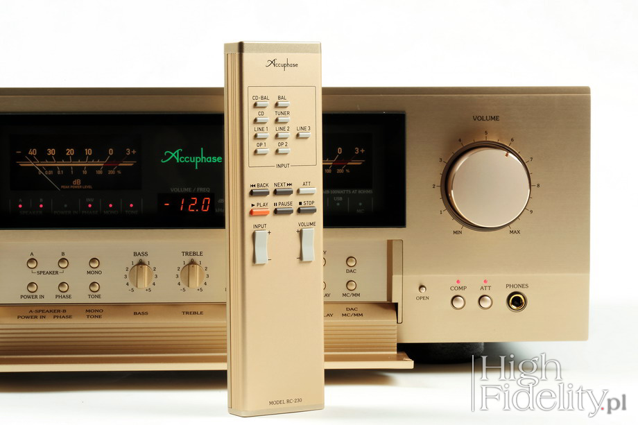 Oprócz wielu wejść i wyjść, zmiany fazy absolutnej itd., wzmacniacz wyposażono także w inne funkcje. Ich manipulatory i przyciski ukryto pod wspomnianą klapką. Jest tam regulacja barwy i balansu, przycisk mono (przydany przy odsłuchu monofonicznych płyt gramofonowych), aktywacja wyjść głośnikowych, wyłączenie podświetlenia wskaźników, aktywacja wejścia bezpośrednio na końcówkę mocy i dwa guziki do pętli nagrywania. Listę uzupełniają dwa przyciski tuż przy wyjściu słuchawkowym typu „duży jack” fi 6,3 mm – to skokowe wyciszenie sygnału o 20 dB oraz kontur. Pilot Pilot zdalnego sterowania RC-230 wygląda jak z filmu si-fi z lat 70. Jest złoty i ma charakterystyczne, kanciaste przyciski. To jednak jeden z lepiej zaprojektowanych pilotów, jakie znam. Przyciski mają różne kształty i kolory i – co bardzo ważne – wyraźny punkt zadziałania. Nie ma zgadywania, czy coś przełączyliśmy, pogłośniliśmy, czy nie, wiemy to od razu. Oprócz przycisków do zmiany siły głosu i wejść są na nim też przyciski do sterowania odtwarzaczem CD lub SACD Accuphase’a. ![]() Dane techniczne (wg producenta) Wejścia ![]() Dystrybucja w Polsce: |