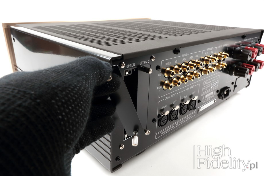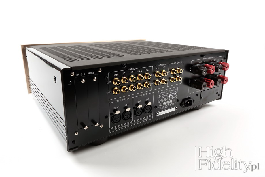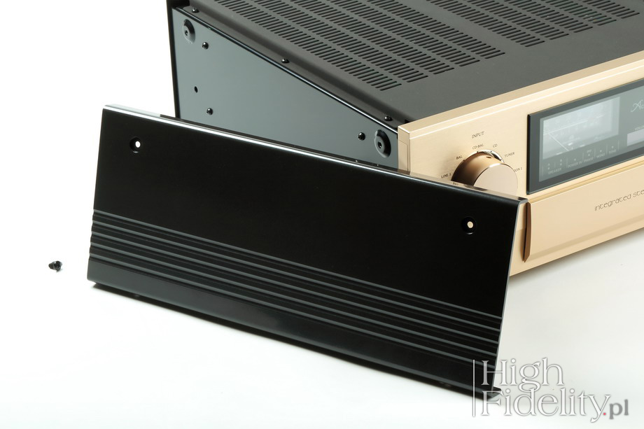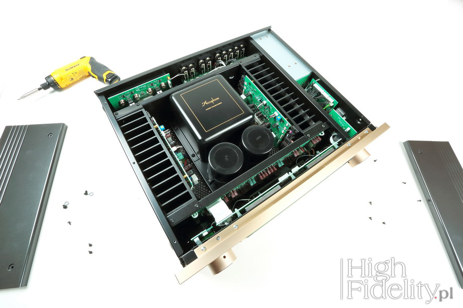 Z tego powodu nie chciałem zaczynać opisu dźwięku od mojego prywatnego wniosku, bazującego na latach słuchania urządzeń tej firmy: zachowując zalety wydajnego zasilacza i niskiej impedancji wyjściowej, dźwięk E-370 zbliża się do tego, co oferują dobrze zaprojektowane, ładnie grające wzmacniacze lampowe, oparte na tertodach strumieniowych KT88 i KT150. Nie chodzi o to, że symuluje ich dźwięk, albo że się pod takie wzmacniacze podszywa – jestem pewien, że to ostatnie, co ludziom z Accu przyszłoby do głowy; 40 lat temu wybrali swoją ścieżkę i są jej wierni, szlifując i polerując to, co wówczas wymyślili. Ilość informacji, jakie dostajemy o instrumentach jest olbrzymia. Także ich rozmach jest imponujący. Urządzenie skupia się na dźwiękach bezpośrednich, nie dodając do nich zbyt dużo akustyki wokół nich, ale już jeśli mówimy o akustyce całości idzie znacznie dalej. Pokazuje wydarzenia zarówno blisko, jak i z oddechem. Rzadko spotykam się z tak dobrym obrazowaniem – i mówię nie tylko o wymiarach wszerz i w głąb, czy w górę, ale także w kierunku słuchacza. Kiedy materiał został w ten sposób przygotowany, tj. jeśli dźwięki miały być pokazywane nie tylko za kolumnami, ale i przed nimi, z boków czy za nami – patrz Stardust Martina Gore’a – Accuphase je tak właśnie pokazywał, bez spięcia, w bardzo fizjologiczny, nienarzucający się sposób. Po prostu były wszędzie wokół nas i nie musieliśmy ich dodatkowo sobie w głowie ustawiać. Było pięknie. Na koniec dwa słowa o wyjściu słuchawkowym. Brzmi ono tak, jakby w E-370 zastosowano osobny wzmacniacz słuchawkowy, a nie pobrano sygnał z wyjść głośnikowych. Z opisu na stronie producenta wiemy, że tak właśnie jest, ale nawet krótki odsłuch mówi to samo. To znakomite wyjście, z piękną górą pasma i mocnym środkiem. Dół nie jest bardzo konturowy, ale utrzymuje się w ramach opanowania i jest przy tym mocny i niski. Wyjście to jest na tyle dobre, że nie widzę potrzeby stosowania zewnętrznego wzmacniacza słuchawkowego poniżej – powiedzmy – 5000 zł. A w dodatku wysterujemy nim dowolne słuchawki, nawet tak trudne, jak HiFiMANy HE-6, co jest wyczynem nie lada – brawo! Podsumowanie E-370 nie jest drogim wzmacniaczem, jak na standardy Accuphase’a, ale również jak na standardy budowy, wyposażenia oraz dźwięku. A mimo to brzmi wspaniale. Jego dźwięk jest połączeniem energetyczności, mocy i gładkiej, niskiej średnicy. Daje to pełny, mocny przekaz z wyraźnym, mocnym basem i gładką górą. Jest też niesłychanie wszechstronnym urządzeniem, którego dźwięk można dodatkowo kształtować przez wybór wejścia XLR lub RCA. Dodajmy do tego znakomity wzmacniacz słuchawkowy i pomyślmy co z tym fantem zrobić – być może to jest właśnie TEN wzmacniacz, którego od dawna szukaliście. Stąd RED Fingerprint. ![]() Już o tym mówiłem: Accuphase to firma inżynieryjna, dlatego swoje produkty wyposaża w szczegółowy i wyczerpujący opis, wraz ze schematem blokowym. Wystarczy spojrzeć na jej urządzenia i już wiemy, że przeżyją niemal wszystko, co dla nich wymyślimy. Podstawą tej zwartej, niepodatnej na drgania konstrukcji jest chassis zbudowane z metalowych płyt spinających boki, dzielących wnętrze na mniejsze komory. To rzecz, którą znamy też z produktów Luxmana, a którą kopiowało tysiąc i jedna firma z Chin. Tutaj mamy oryginał. Dzięki temu poszczególne sekcje są od siebie ekranowane, co zmniejsza szumy i zakłócenia. Z boków dokręcono dodatkowe płyty metalu, które będąc elementami ozdobnymi jeszcze bardziej usztywniają obudowę. Jakość dźwięku poprawiona została także przez postawienie wzmacniacza na nóżkach z żeliwa. Pośrodku widać największy element, tj. puszkę transformatora zasilającego i kondensatory filtrujące. Zmontowano je na dodatkowej „podłodze”, a nie na wspólnym stelażu. Puszka ma kwadratowy przekrój, ponieważ zastosowano tutaj transformator typu EI, a nie toroidalny. Został on zalany materiałem tłumiącym drgania i poprawiającym odprowadzanie ciepła. Po bokach mamy końcówki mocy przykręcone bezpośrednio do bardzo dużych, odlewanych z aluminium radiatorów. To układ dyskretny, z dwoma parami na kanał, pracujących równolegle tranzystorów bipolarnych firmy Sanken (2SA1186 + 2SC2837). Przedwzmacniacz Sygnał do końcówek mocy biegnie z tylnej ścianki, gdzie umieszczono płytkę z układem AVVA. To rozbudowany układ zmieniający poziom sygnału, ale nie przez jego tłumienie, a zmianę prądu – na wejściu sygnał napięciowy zamieniany jest na prądowy, a potem z powrotem na napięciowy. Sekcja ta sterowana jest ładnym potencjometrem Alpsa, który zwykle służy do tłumienia sygnału. W selektorze wejść zastosowano hermetycznie zamknięte przekaźniki zaprojektowane do pracy w ciężkich warunkach przemysłu telekomunikacyjnego. Sterowane są one układami logicznymi w specjalnie przygotowanej konfiguracji, ułatwiającej integrację rozbudowanego systemu, w tym źródeł z wyjściami zbalansowanymi, które są bardziej odporne na zakłócenia niż wyjścia RCA. Zbalansowany układ sprzężenia zwrotnego działa zarówno w gałęzi dodatniej sygnału, jak i ujemnej. Układ podłączony jest tuż przed gniazdami wyjściowymi, gwarantując niską impedancję i wysokie tłumienie wyjścia („damping factor”). Specjalnie pod tym kątem przeprojektowana została płytka z układem sprzężenia zwrotnego. Siłę sygnału wejściowego można odczytać na ładnych, wychyłowych wskaźnikach VU-metr, które pokazują też moc wyjściową, ale tylko przy teoretycznie płaskim obciążeniu 8 Ω. Wskaźnik ten podświetlany jest diodami LED, co znacząco poprawia jego długowieczność. Wybraną siłę głosu odczytamy z alfanumerycznego wyświetlacza w bursztynowym kolorze. Jeśli wzmacniacz wyposażymy w opcjonalną płytkę z przetwornikie