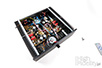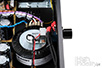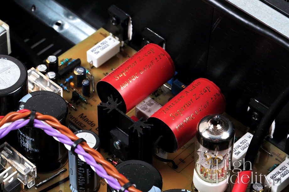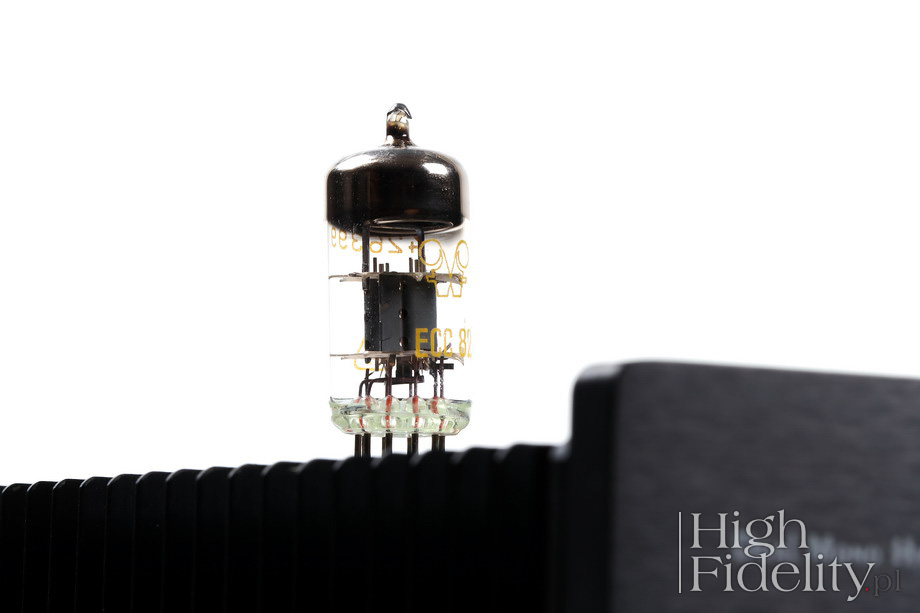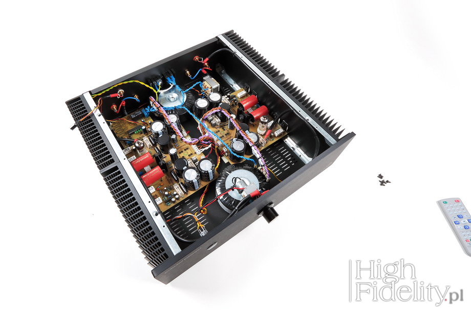 Tył jest równie oszczędny. W wersji w teście mamy tylko jedną parę wejść sygnału analogowego, na gniazdach RCA firmy Neutrik, oraz dwie pary zacisków głośnikowych, po jednej na kanał. Wszystkie gniazda są złocone. Wejścia liniowe są rozłożone po bokach, nie są przy sobie, co może utrudnić stosowanie interkonektów, które maja na stałe złączone obydwa biegi. Ale tak właśnie wygląda konsekwentna realizacja układu dual-mono i tak też swoje urządzenia obsadza firma Gryphon. Wzmacniacz możemy wyposażyć w dodatkowe wejścia, za dopłatą. Pośrodku jest gniazdo sieciowe IEC z mechanicznym wyłącznikiem i bezpiecznikiem. Wzmacniacz stoi na niziutkich, plastikowych nóżkach, co utrudnia jego przenoszenie. Umieszczone po bokach duże radiatory mają zaokrąglone krawędzie, ale i tak są dość ostre – należy więc do przenoszenia wzmacniacza stosować rękawice ochronne, będzie bezpieczniej niż bez nich. Środek Wygląd środka wzmacniacza zmienia się wraz z czasem. Dla przykładu, na zdjęciach zamieszczonych na stronie internetowej producenta obydwa transformatory umieszczone są z przodu, a w testowanym egzemplarzu jeden jest z przodu, a drugi z tyłu. Ten z przodu jest dokładnie pod potencjometrem. Zapytany przeze mnie o to, czy aby przypadkiem nie powoduje to brumienia (przydźwięku) i czy nie zwiększa szumów, konstruktor odpowiedział, że nie. Transformatory mają moc po 200 W każdy. Jak na 20-watowy wzmacniacz (przy 8 Ω) to naprawdę duży zapas mocy. Generalnie jednak to zawsze jest ten sam wzmacniacz. Ma on budowę dual mono i to prawdziwa, tj. z dwoma zasilaczami, dwoma przedwzmacniaczami i dwoma końcówkami mocy. Znakomita większość producentów mówiących o dual-mono ma na myśli wspólny transformator i oddzielne uzwojenia wtórne dla lewego i prawego kanału. Każde z tych rozwiązań ma wady i zalety. Firma Atoll Electonique robi jeszcze inaczej – ma osobne wzmacniacze mocy, ale stosuje wspólny zasilacz dla obydwu kanałów, uważając, że tylko w ten sposób można zoptymalizować przebieg masy. Cały układ zmontowano na dwóch płytkach drukowanych, lewego i prawego kanału. Montaż płytek jest tradycyjny, przewlekany. Obydwie są identyczne, obrócono je tylko o 180º, aby dało się przykręcić tranzystory mocy do radiatorów po bokach. Na płytce jest i lampowy przedwzmacniacz, w testowanej wersji na podwójnych triodach ECC 82 firmy RFT, typu NOS, a także wzmacniacz mocy, na polowych tranzystorach International Rectifier HEXFET IRFP240 + IRFP9240, pracujących w klasie A, w układzie push-pull (po dwie pary na kanał). Jak podaje producent, we wzmacniaczu można zastosować, po zmianie punktów pracy lamp, modele: ECC81, ECC82, ECC83, ECC85, ECC88, 6N1P, 6N6P i ich odpowiedniki. Istnieje także wersja z lampami oktalowymi 6SN7 i 6SL7 i to właśnie z ich dźwiękiem w głowie wzmacniacz był „dostrajany”. Lampy wsuwane są do świetnie wyglądającej, ceramicznej podstawki ze złoconymi pinami Noval Gold. Sygnał z lamp prowadzony jest do tranzystorów sterujących poprzez bardzo dobre, na tym poziomie cenowym bardzo rzadko widywane, kondensatory polipropylenowe Jantzen Audio Superior Z-Cap. Także one mogą zostać zmienione na inne, za dopłatą. Wszystkie oporniki są precyzyjne (1%) z firm DALE i Beyschlag. Na wejściu umieszczono niewielką płytkę, na której można obsadzić przekaźniki wybierające aktywne wejście – w testowanym egzemplarzu ich nie było. Na tej samej płytce jest zasilacz układu standby; jego transformator umieszczono po drugiej stronie transformatora toroidalnego. W kolejnych egzemplarzach ma on być przy układzie, który zasila. Sygnał z gniazd RCA jest tu od razu przesyłany do przedniej ścianki, do potencjometru Alpsa Blue – klasycznego, obrotowego. Jest on sterowany silniczkiem, ponieważ wzmacniacz można wyposażyć w pilot zdalnego sterowania. Do potencjometru i potem do końcówek prowadzą długie interkonekty. Można by je zmniejszyć, przenosząc Alpsa na tył, wydłużając jednocześnie jego oś do przedniej ścianki. Ale to dodatkowe koszty.