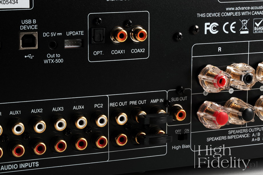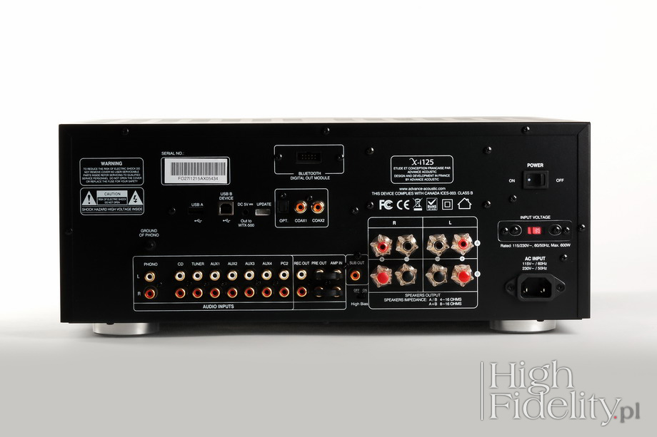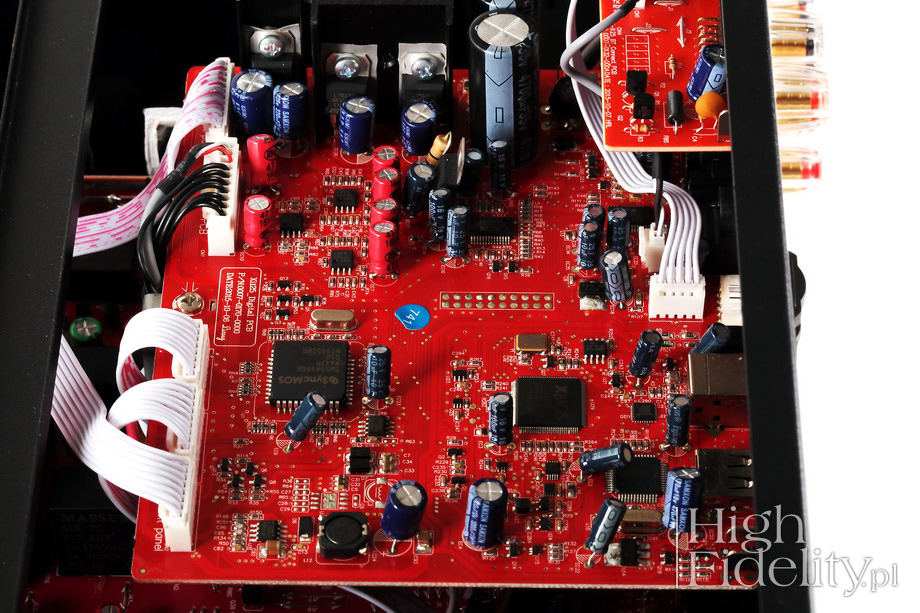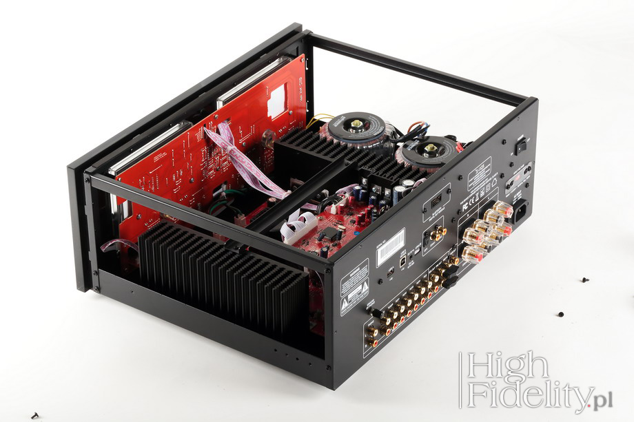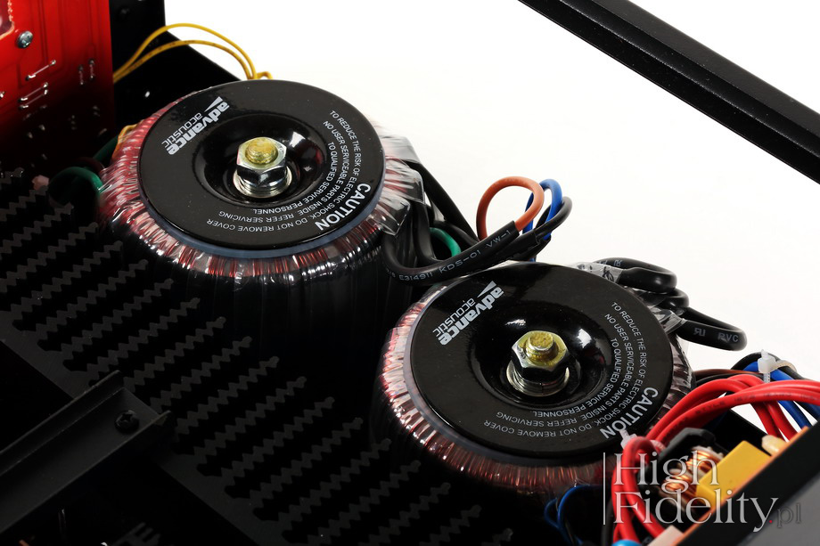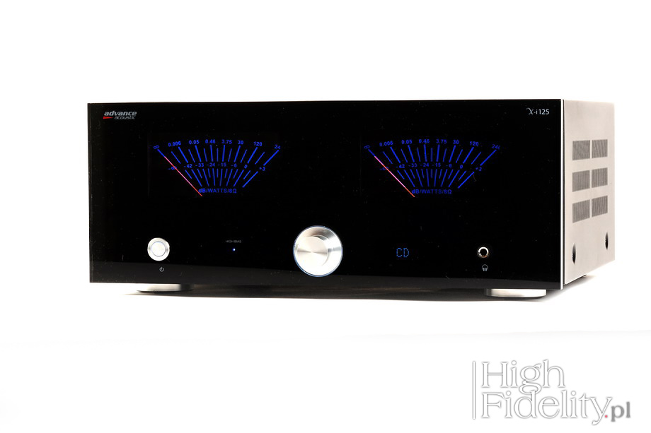 Podsumowanie Zwiększenie mocy nie jest zabiegiem liniowym, razem z dodaniem „oddechu” zmieniamy też inne aspekty dźwięku. Zalety, jakie w ten sposób z X-i125 otrzymujemy, to bardzo ładna barwa i znakomity bas. Wzmacniacz bardzo dobrze panuje nad kolumnami i zagra głośno i dobrze w dużych pomieszczeniach. Podnosząc się głosu nie zmieniamy w jakiś szczególny sposób dźwięku, co też jest bardzo dobre. Jeśli nie potrzebujemy wysokiej mocy, model X-i75 całkowicie nam wystarczy, bo w zamian oferuje nieco większą koherencję i spójność. Ale w audio, jak zawsze, mamy coś za coś. Z X-i125 mamy duże COŚ. ![]() Z zewnątrz X-i75 oraz X-i125 różnią się gabarytami. Patrząc do wnętrza widać, że chodziło raczej o efekt wizualny i że nie było to wymuszone względami technicznymi, poza jednym – większa przestrzeń oznacza lepsze chłodzenie radiatorów, które w mocniejszej wersji grzeją się bardziej. Poza tym wydaje się, że mamy do czynienia z bardzo podobną konstrukcją, tyle że zamiast jednego transformatora mamy dwa, a zamiast dwóch płytek końcówek mocy mamy jedną, wspólną, a także zamiast jednej pary tranzystorów prądowych (końcowych) na kanał, w X-i125 mamy dwie pary. Dopiero przy bliższej inspekcji okazuje się, że inny jest przedwzmacniacz, inne tranzystory mocy, odmienny zasilacz i jedynie płytka cyfrowa jest ta sama. Przód To rzecz, która przyciąga wzrok i jest dominantą wzmacniaczy Advance Acoustic – duże, wychyłowe VU-metry, pracujące tutaj jako wskaźniki mocy. Są podświetlane na niebiesko, a strzałka jest czerwona. Tego typu rozwiązanie kojarzymy oczywiście z amerykańskim McIntoshem, i dobrze, ale to tylko jeden, choć najbardziej znany, przykład stosowania wskaźników. Przypomnijmy, że stosują je także japońskie Accuphase i Luxman, niemiecki Restek, amerykańskie Audio Research i Dan D’Agostino, a w Polsce znamy je np. ze wzmacniaczy Linear Audio Research. Patent świetny i niezwykle widowiskowy. Poza nimi właściwie nic tutaj nie ma, co dobrze świadczy o smaku designerów. To tylko niewielka, aluminiowa gałka siły głosu – bardzo dobrze, że obrotowa – będąca jednocześnie przyciskiem, wyłącznik standby oraz gniazdo słuchawkowe 6,3 mm. Na niebiesko wyświetla się nazwa wybranego wejścia, a niebieską diodą LED oznaczono włączenie trybu „High Bias”, z którym został przeprowadzony test. Tył Konstruktorzy postarali się o to, aby X-i125 był możliwie najwszechstronniejszym urządzeniem i prawdziwym centrum systemu audio. Mamy więc pięć wejść liniowych, wejście gramofonowe (dla wkładek MM), pięć wejść cyfrowych (USB B, USB A dla odtwarzaczy mp3, 2 x koaksjalne RCA i optyczne Toslink) i wejście dla zewnętrznego modułu Bluetooth X-FTB01, spięte zworami (warto je kiedyś wymienić na inne) wyjście z przedwzmacniacza i wejście na końcówkę mocy, monofoniczne wyjście dla subwoofera oraz podwójne wyjścia głośnikowe, umożliwiające zastosowanie kabla bi-wiring lub podłączenie dwóch par głośników. Każdą z nich można włączyć lub wyłączyć w menu urządzenia. Materiały firmowe nic nie mówią o parametrach granicznych dla wejść cyfrowych, ale można założyć, że akceptują one sygnał PCM do 24 bitów, 192 kHz. Menu Na niebieskim wyświetlaczu alfanumerycznym odczytamy wybrane wejście, a także – kiedy ruszymy gałką siły głosu – poziom głośności. Po przyciśnięciu gałki wchodzimy w menu, w którym możemy zmienić barwę, w zakresie +/- 10 dB, balans między kanałami, wybrać aktywne wyjścia głośnikowe lub odłączyć moduł regulacji barwy („By Pass”). Środek Sygnał trafia do niezłoconych gniazd RCA (złocone są tylko masy), po których jest przełączany w scalonym selektorze wejść i tłumiony w scalonej drabince rezystorowej. Przedwzmacniacz wygląda jednak na klasyczny, dyskretny, tj. oparty na tranzystorach – został zmontowany na niewielkiej płytce, wlutowanej do płytki głównej. Układy scalone znajdziemy w innych miejscach – w sekcji przedwzmacniacza gramofonowego, wyjścia z przedwzmacniacza oraz przy wyjściu subwooferowym; wszędzie tam pracują japońskie scalaki JRC2068. Część elementów pasywnych jest standardowa, ale niektóre, np. foliowe kondensatory, wyglądają bardzo ładnie. Płytka z wejściami cyfrowymi została zamontowana piętrowo, nad wzmacniaczem. To dokładnie ta sama płytka, co we wzmacniaczu X-i75, a więc z układem DAC Wolfson WM8740 (24/192). Jak pisałem, to dobry układ, z którego korzysta wiele innych firm, np. Cambridge Audio. Jest prosty w aplikacji, ponieważ zintegrowano w nim filtry wyjściowe i konwersję I/U. Ponieważ ma wyjście zbalansowane, pozwoliło to zmniejszyć zniekształcenia, prowadząc część obróbki sygnału w trybie różnicowym; dopiero na wyjściu mamy pojedynczy, stereofoniczny scalak JRC2068, w wersji do montażu powierzchniowego. W ogóle większość płytki została tak polutowana. Przy asynchronicznym wejściu USB widać układ XMOS z ładnym zegarem taktującym. Końcówki zmontowano symetrycznie po obydwu stronach. Sterujące tranzystory bipolarne średniej mocy przykręcono do niewielkich radiatorów, a tranzystory końcowe do właściwych, dużych. W komplementarnym układzie, w klasie AB, pracują tam dwie, równoległe pary tranzystorów bipolarnych firmy ON Semiconductor (NJW0302 + NJW0281) na kanał. We wzmacniaczu X-i75 użyto innych tranzystorów. W modelu X-i125 zastosowano układ „High Bias”, udoskonalony w stosunku do wersji z X-i120, tak aby krzywa obciążenia była regularna do ok. 20% mocy maksymalnej wzmacniacza. Dzięki temu na niższych poziomach głośności uzyskano lepszą dynamikę, reprodukcję detali i niższe zniekształcenia.