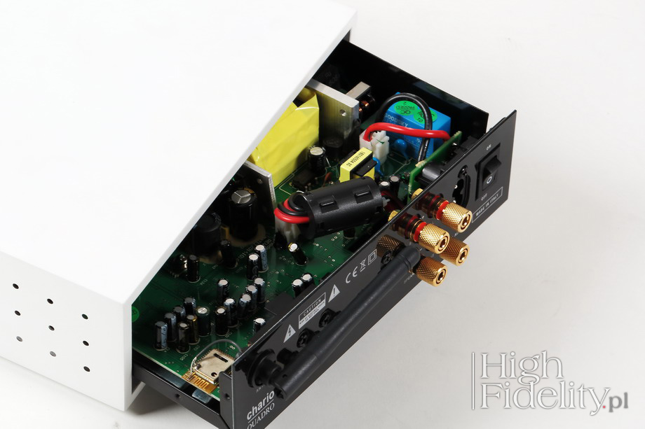 Wzmacniacz jest niewielki i całkowicie można nakryć go 7” winylowym singlem. Obudowę wykonano z niezbyt grubej płyty MDF oklejonej białym winylem. Po bokach wycięto niewielkie okrągłe otworki, a od spodu większe, podłużne szczeliny. Mają one chłodzić wnętrze – wzmacniacz nagrzewa się mocniej niż się tego spodziewałem. Całość postawiono na czterech, przyklejanych podstawkach z gumy. Front wykonano z mlecznego, półprzezroczystego materiału o nazwie Corian (polimer akrylowy + wodorotlenek glinu [ATH]). To materiał firmy DuPoint (odpowiedzialnej m.in. za Teflon), stosowany najczęściej na blaty kuchenne, ponieważ jest niezwykle wytrzymały mechanicznie. Ale też świetnie wygląda. W Quadro pod powierzchnią zamontowano białe diody, wskazujące wybrane wejście i przejście w stan „uśpienia” (standby). Możemy go uśpić przyciskiem na pilocie zdalnego sterowania, albo sam się uśpi po 15 minutach bez sygnału. Ładnie komponuje się z tym złocona, wykonana z mosiądzu, gałka. Z tyłu jest mechaniczny wyłącznik sieciowy, wejścia analogowe RCA oraz mini-jack 3,5 mm, a także wejście optyczne TOSLink, do którego można dostarczyć sygnał aż do 24 bitów i 192 kHz. Jest też wyjście liniowe, monofoniczne, przeznaczone dla subwoofera. Gniazdo sieciowe to tzw. „ósemka”, szkoda, że nie klasyczne IEC. Warto więc kupić kabel przygotowany w ten sposób (np. Audioquest), albo wykorzystać przejściówkę. Warto, bo to dobry wzmacniacz, który zasługuje na coś lepszego niż cienki, nijaki kabel, który dostajemy w komplecie. Elektronikę zmontowano na pojedynczej płytce drukowanej, przykręconej do stalowego chassis. Zasilacz impulsowy jest częścią wzmacniacza w klasie D. Na wyjściu widać pojedynczą tuleję ferrytową, tę samą dla obydwu kanałów, tworzącą wraz z kondensatorami wyjściowymi filtr „rekonstrukcyjny”. Siła głosu sterowana jest enkoderem sprzężonym z przełącznikiem wejść. Niestety wszystkie układy nalutowano od spodu i bez całkowitego demontażu nie da się dojrzeć, kto je wyprodukował.