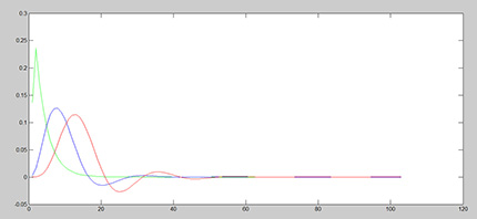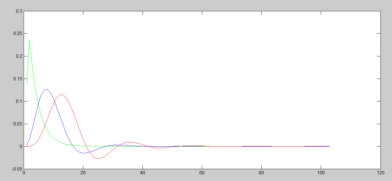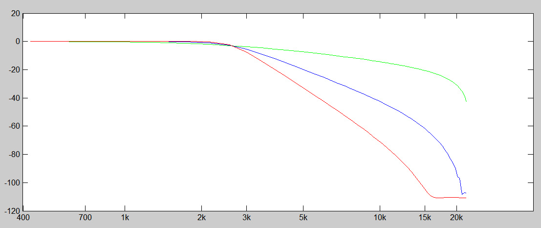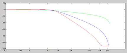 Porównanie skuteczności przykładowych filtrów 1. (zielony), 3. (niebieski) i 5. rzędu (czerwony) w dziedzinie częstotliwości. Oś X to tłumienie sygnału w decybelach, oś Y to częstotliwość w skali logarytmicznej. Jak widać na powyższym rysunku na przykładzie filtru dla częstotliwości ok. 2 kHz łagodny filtr pierwszego rzędu nie osiąga nawet przyzwoitej wartości tłumienia na poziomie około -30 dB przy 10-krotnie wyższej częstotliwości 20 kHz. Zastosowanie filtru np. 5. rzędu daje diametralną zmianę, -30 dB mamy już przy podwojeniu częstotliwości. W przypadku materiału CD mamy do czynienia z tak małą przestrzenią do wykonania filtracji, ze wymagane są filtry o bardzo agresywnych parametrach w dziedzinie częstotliwości. I tak dochodzimy do największej zalety materiału hi-res – daje on bez porównanie większe pole do wykonania niezbędnych operacji DSP. Mamy do dyspozycji nie 10% a ponad 100% oktawy ponad 20 kHz ponieważ czestotliwość próbkowania 96 kHz daje nam maksymalną częstotliwość 48 kHz i w rezultacie 28 kHz (48 kHz – 20 kHz maksymalnej częstotliwości słyszalnej) zamiast 2 kHz w przypadku CD na wykonanie odpowiedniego przetwarzania DSP. To pozwala zastosować dużo łagodniejsze filtry o zupełnie innej charakterystyce i bez porównania lepszych parametrach jeśli chodzi o niezmiernie ważne transjenty w audio. Tak więc możemy zastosować filtry, które posiadają słabsze co do skuteczności filtracji, ale dla materiału hi-res wystarczające filtry niższego rzędu, które natomiast mają zdecydowaną przewagę w dziedzinie czasu co łatwo zaobserwować przez porównanie rys. 2 (powyżej) i rys. 3 (poniżej).