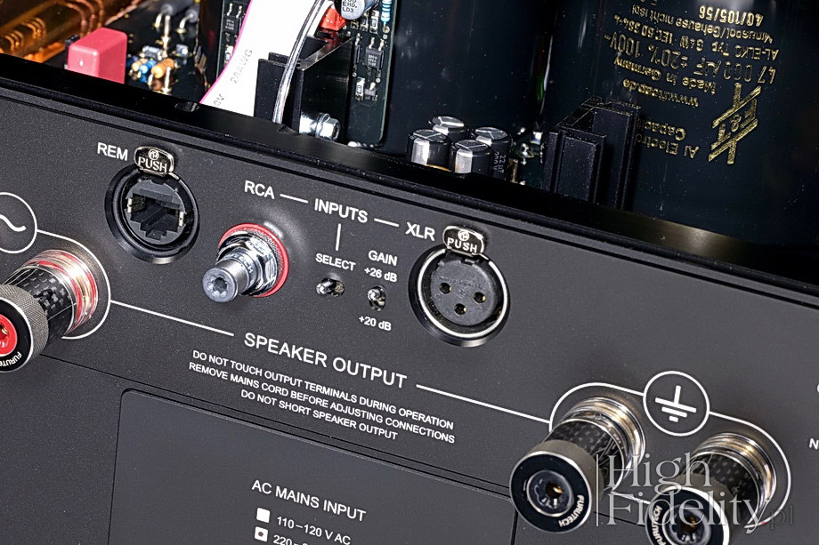 Do środka testowanych urządzeń nie zaglądałem – jakiekolwiek operacje z 90 kg bestiami zdecydowanie przerastają moje siły. Opierając się więc na informacji od producenta napiszę, że każde wzmacniacz wyposażono w 2500 VA trafo, robione na zamówienie, że w zasilaczu pracują kondensatory filtrujące o łącznej pojemności 500 000 µF i że cały układ jest dyskretny. ![]() Dane techniczne (wg producenta) Line & Power Block |