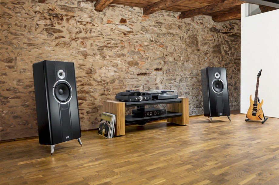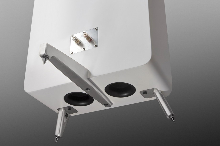 Na dole pracuje spory, 275 mm woofer z membraną wykonaną ze specjalnego papieru, dla którego producent stosuje własną nazwę „kraft” (co w języku niemieckim oznacza „siłę”), z odlewanym, aluminiowym koszem i gumowym zawieszeniem. Na górze pracuje 28 mm miękka, jedwabna kopułka z silnym magnesem. Umieszczono ją w niewielkim, aluminiowym falowodzie. Oryginalną obudowę wykonano z kilku warstw MDF-u. Nie dość, że jej wymiary są dość specyficzne – mówię o sporej szerokości wynoszącej 440 mm przy głębokości samej obudowy rzędu jedynie 200 mm – to dodatkowo producent zaokrąglił wszystkie rogi, co zdecydowanie dodaje tej konstrukcji uroku. Dorzućmy do tego wykończenie białym lub czarnym półmatowym lakierem i wspominane już pionowe szare paski i dostajemy naprawdę ciekawy dizajn, który będzie przyciągał wzrok. Skuteczność na poziomie 95 dB przy przyjaznym przebiegu impedancji sprawia, że niemieckie kolumny spisują się równie dobrze już z 8 W SET-em na lampie 300B, ale znakomite efekty brzmieniowe osiąga się również z mocnym tranzystorem. ![]() Dane techniczne (wg producenta)