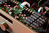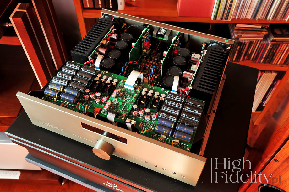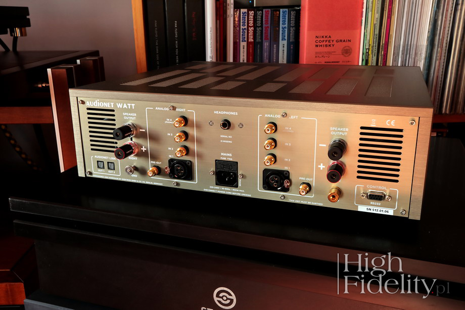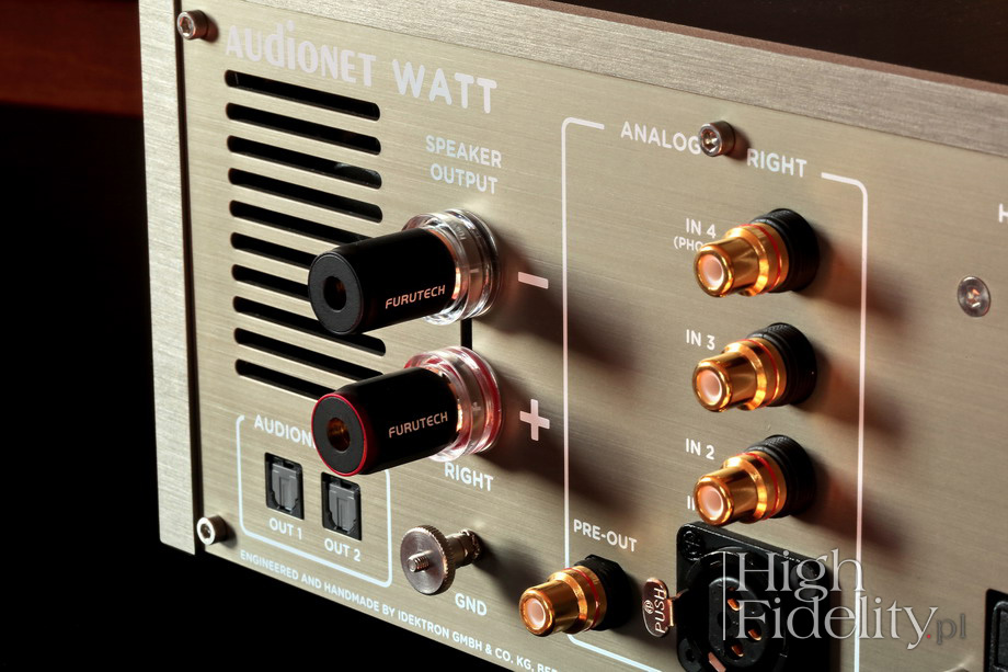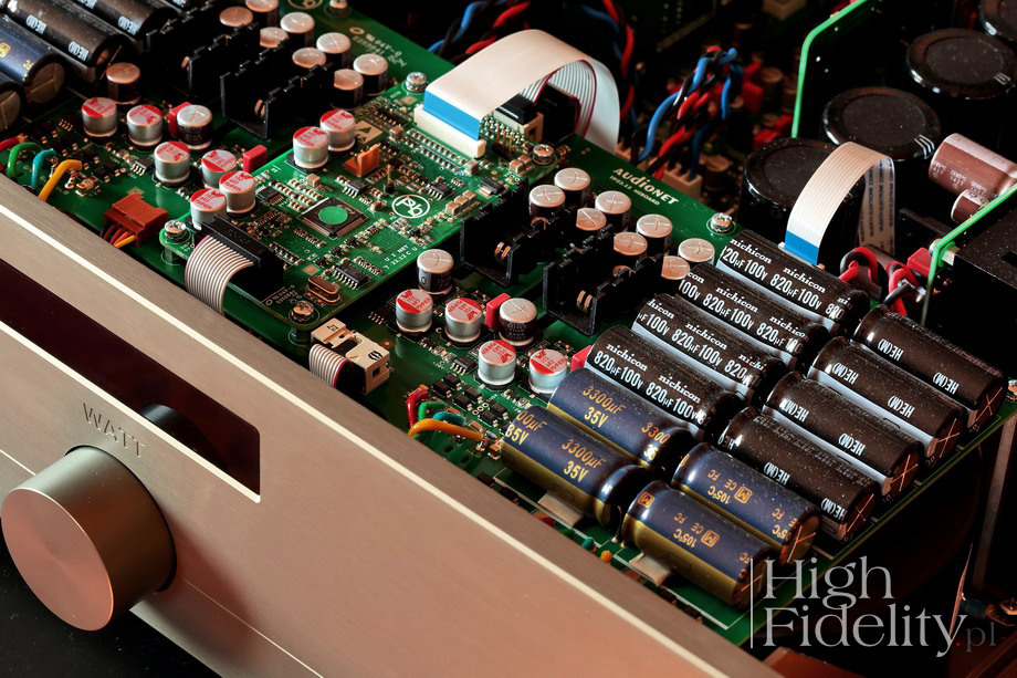To skupienie na celu, a jest nim jak najwięcej muzyki w muzyce, co słychać będzie i w funkcji barwy, i przestrzeni. Ta ostatnia zostanie pokazana w dystyngowany sposób, nawet z najbardziej wyrafinowanymi nagraniami. Jak np. z The Planets Holsta w wersji zarejestrowanej przez naszego przyjaciela Rene LaFlamme. W tym nagraniu z 2012 roku wykorzystał wyłącznie mikrofony lampowe w purystycznym ustawieniu i nagrał materiał na taśmę analogową na lampowym magnetofonie Ampex 354. Wytłoczona z niej płyta LP posłużyła do strojenia prototypu gramofonu Kronos – Rene jest w ten sposób jego „ojcem chrzestnym”. Z Audionetem doskonale wiedziałem, dlaczego to takie wyjątkowe nagranie, bo miało dynamikę, barwę i przestrzeń, jakiej oczekuje się od najlepszych nagrań. A Pet Shop Boys? Największe przeboje tego duetu wydane zostały w Japonii, ale w zabezpieczony sposób (Copy Control Disc). Mimo to słabości środka pasma i góry nie były dokuczliwe. Płyt wysłuchałem z przyjemnością. I właściwie nie ma co tego ciągnąć, bo musiałbym się powtarzać. Mogę oczywiście dodać, że dynamika to kolejny „ukryty” element, bo bardziej podskórny niż noszony na pokaz i że jest jej mnóstwo, ale nie odbieramy tego jak czegoś osobnego, sztucznego. Wszystko w tym wzmacniaczu współgra ze sobą w budowaniu naturalnego, naturalnie ciemnego dźwięku o ogromnej wewnętrznej energii i swobodzie. Aż trudno uwierzyć, że to gra tranzystor, a przecież wcale nie słyszymy „lampy”, nie chodzi tu o symulowanie czegokolwiek. To po prostu dobre granie. Podsumowanie Inżynierowie Audioneta działając w zgodzie z inżynierskim idiomem, zmniejszając zniekształcenia, kształtując je w odpowiedni sposób, dbając o różnego typu elementy, które do niedawna były uważane za voodoo, jak np. dopracowane gniazda głośnikowe, wybrane podzespoły, rola obudowy i nóżek, żeby pozostać przy najbardziej obrazoburczych, doprowadzili do tego, że wszystko nagle „wskoczyło” na swoje miejsce. Na pewno macie państwo takie przeżycia za sobą dlatego chciałbym się do nich w tej chwili odwołać – grając muzykę z WATTa, z wysmakowanymi kolumnami, źródłem i oprzyrządowaniem usłyszymy więcej muzyki niż do tej pory. To niewielki wzmacniacz, można nawet powiedzieć, że niepozorny, a jednocześnie gigant muzyki. Jest niezwykle uniwersalny i większość płyt zagra w olśniewający sposób. Trochę oszlifuje jedynie te najbardziej motoryczne, które wymagają trochę brudu za paznokciami. I nigdy nie zabrzmi zbyt jasno. Bardzo, bardzo mi się ten świat podoba! ![]() WATT jest analogowym, tranzystorowym wzmacniaczem zintegrowanym o mocy wyjściowej 167 W (8 Ω), który zagra także z niskim obciążeniem oddając do 2 Ω aż 443 W! Na jego przedniej ściance widać tylko kilka elementów – przede wszystkim średniej wielkości gałkę siły głosu, spory wyświetlacz i kilka srebrnych przycisków. Gałka siły głosu jest tak naprawdę enkoderem, sterującym scalonym układem z drabinką rezystorową, ale obsługuje się ją jak gałki japońskich kolosów z lat 70. – stawia lekki opór i ma sporą bezwładność. Z tyłu zobaczymy znakomite gniazda głośnikowe Furutecha z rodowanymi stykami. Gniazda RCA i XLR są złocone i pochodzą od Neutrika. Wzmacniacz ma budowę niezbalansowaną, ale dla wygody dodano jedno wejście XLR. Tuż za nim mamy desymetryzator. Są tu cztery wejścia liniowe i jedno wyjście z przedwzmacniacza. Jedno z wejść można zamienić na wejście gramofonowe. W tym celu trzeba kupić opcjonalne płytki, które montowane są „na plecach” płytek przedwzmacniacza, dzięki czemu sygnał pokonuje minimalną drogę, bez żadnych interkonektów po drodze. Przedwzmacniacz ma budowę dual mono – to pionowe płytki wpięte do dużej płytki-matki na dnie urządzenia. Ta sekcja zbudowana jest z wykorzystaniem układów scalonych, głownie Burr Brown OPA827 i OPA277. Wokół nich widać bardzo dobre elementy bierne, np. kondensatory Wima i precyzyjne oporniki. Przedwzmacniacz gramofonowy to również dwa układy scalone, ale w otoczeniu bardzo dobrych elementów biernych. Na dużej płytce pod spodem widać wzmacniacz słuchawkowy, także na wspomnianych scalakach, ale z wyjściem na parach tranzystorów bipolarnych 2SA1507 + 2SC3902. Końcówki mocy przykręcono bezpośrednio do niewielkich radiatorów. W czasie testu tego nie słyszałem, ale okazuje się, że radiatory chłodzone są małymi wiatraczkami. W każdym kanale pracują dwie pary tranzystorów, w układzie push-pull, w klasie AB. Każdy z nich jest opisany karteczką – widać, że były mierzone i dobierane. Także i tutaj mamy znakomite elementy bierne.