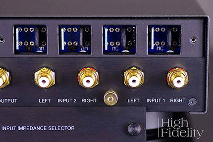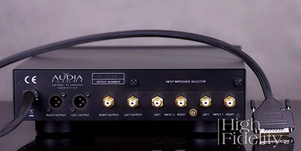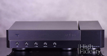 Tył przedwzmacniacza to trzy pary gniazd RCA (dwa wejścia i wyjście), zacisk uziemienia, wyjście XLR, zamontowany na stałe przewód zasilający zakończony wielopinową, przypominającą złącze euro wtyczką oraz ukryty pod mocowaną dwoma śrubkami klapką zestaw gniazd, w których montuje się zworki pozwalające wybrać impedancję i pojemność dla każdego z wejść. Na tylnej ściance zasilacza znajduje się stosowne gniazdo, do którego wpinamy wtyczkę kabla zasilającego przedwzmacniacza, zintegrowane z włącznikiem głównym gniazdo IEC oraz port firmowej magistrali AU-Link z hebelkowym przełącznikiem trybu pracy (master/slave). Producent dla wkładek MM i MC stosuje inne układy wzmacniające sygnał, stąd możliwa jest dowolna konfiguracja przedwzmacniacza na etapie zamówienia od producenta. W zależności od dokonanego wyboru montowane są odpowiednie (różne dla MM i MC) płytki dla każdego z wejść. Za pierwszym stopniem wzmacniającym umieszczono selektor wejść z pozłacanymi przekaźnikami, dalej pasywny filtr RIAA oparty o precyzyjne kondensatory polipropylenowe i polistyrenowe. Na tym etapie włączany jest (lub nie) również filtr subsoniczny. Drugi stopień wzmacniający, nazwany przez producenta MCF NG1 oferuje 24 dB gainu, który opcjonalnie można zwiększyć o kolejne 10 dB. W zasilaczu pracują dwa transformatory toroidalne (50 i 15 VA), z których pierwszy zasila obwody analogowe, drugi natomiast układy logiczne urządzenia. ![]() Dane techniczne (wg producenta) Wzmocnienie (Gain): ![]() |