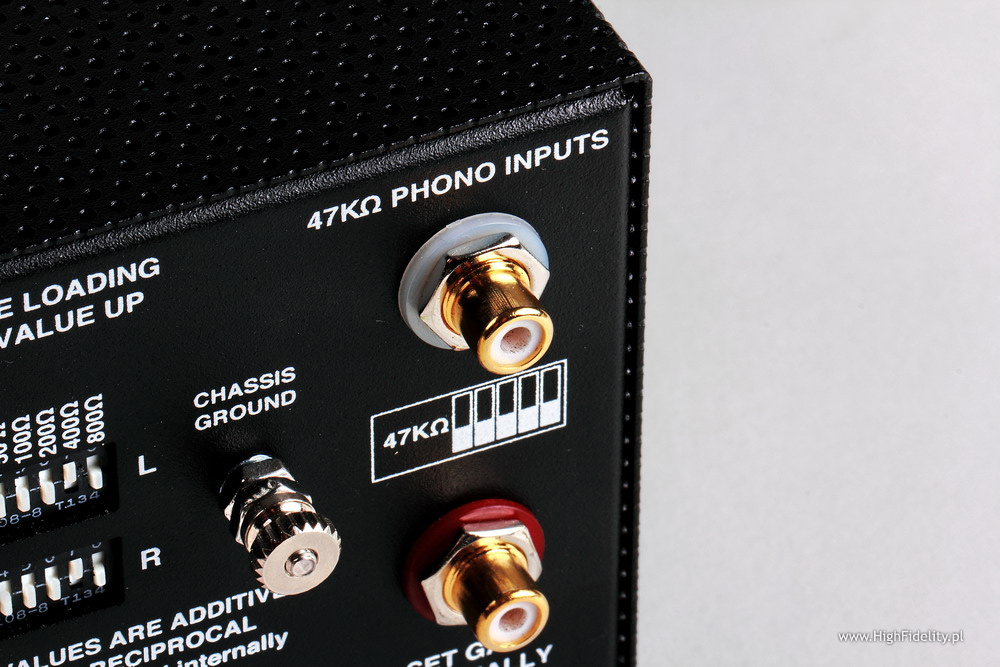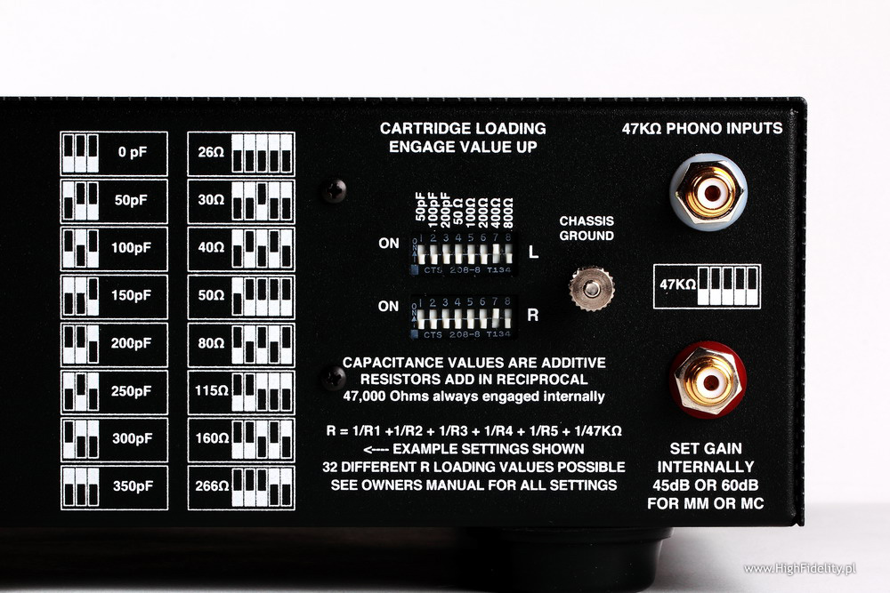 The Chinook can be adapted to a particular cartridge. The change from the MM to MC is somewhat awkward – we need to remove the cover and get inside in order to access it. We set gain to 45 dB for MM cartridges and 60 dB for MC cartridges. Other adjustments - impedance and capacity – are found on the back panel in the form of typical micro-DIPs. There are 31 available settings covering the impedance range of 26 Ω - 800 Ω and a separate 47 kΩ setting for the HO MM or MC cartridges. Capacity can be set in the range of 50 pF - 350 pF (in seven steps).