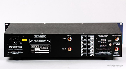 DESIGN The Chinook is a MM/MC phone tube preamplifier with a solid state power supply. Its look is characteristic for the American manufacturer – a thick aluminum front panel in characteristic color with an illuminated window sporting the company and model logo. Below the window there is a blue-lit mechanical switch. There are rack-mount ears on both sides of the front panel with milled holes for rack mounting.Preamp gain can be set to either 45 dB or 60 dB; input impedance and capacitance can also be adjusted. The gain switch is located inside the enclosure while the impedance and capacitance mini-DIP switches can be accessed on the back panel. There is a detailed description of the available settings at the back. We have very many steps - 32 for impedance and 7 for capacity adjustment. On one side of the switches area there is a widely spaced pair of stereo input sockets and output sockets on the other side. The sockets with Teflon dielectric are manufactured by Manley. Actually, most components are manufactured in house at the company’s own factory in California. The back panel also sports an EIC socket.