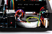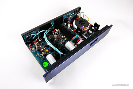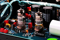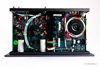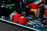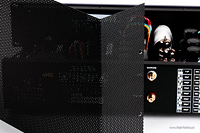 Amplification circuit is based on vacuum tubes – the input stage is built on two 6922 Electro-Harmonix dual-triodes per channel (replacement: 6DJ8, 7308, ECC88); another 6922 dual triode works in the White-cathode-follower (WCF) output stage; these are NOS tubes from JAN (Joint Army Navy) military surplus. In order to prolong their life, they are equipped with an automatic timer. Switching on the Chinook by pushing the front panel button leaves the output muted while anode voltage is gradually raised. After 45 seconds the relay clicks in and the device is ready to work. Manley declares the deviation from the RIAA curve to be less than ± 0.5 dB in the 20 Hz-20 kHz range (typically less than ± 1 dB between 10 Hz and 100 kHz).The whole electrical circuit is mounted on two printed circuit boards, separated by a metal screen - one is the power supply board, and the other is the amplification circuit. Power supply is based on a large, flat toroid transformer. Both filament and anode voltages are rectified and stabilized. Additional filtering of the anode voltage is based on components placed right next to the tubes.