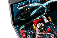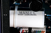 The output stage features very large, polypropylene coupling capacitors – MIT MultiCap. All electrolytic capacitors in the power supply bear the Manley logo, but they are known to be manufactured by Cornell-Dublier. The input and output are connected to their respective sockets via cables manufactured by Manley, shielded with aluminum foil.