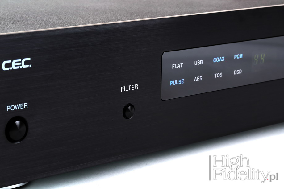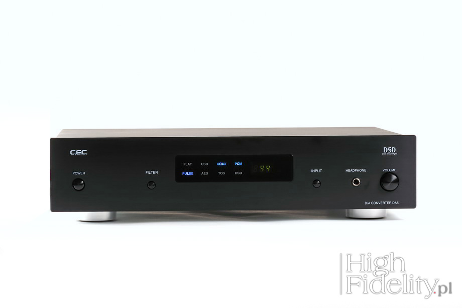 Daje dobry wgląd w nagrania, ale nie każe się „chlastać” ich błędami. Niski bas i wysoka góra są wycofanie i to nie one stanowią o wartości tego przetwornika. Są to: gęstość, płynność i wiarygodność. Nieco ciemniejszy dźwięk niż z wielu nowoczesnych przetworników D/A jest wartościowym uzupełnieniem oferty rynkowej. ![]() DA-5 firmy CEC jest przetwornikiem cyfrowo-analogowym, z którym zintegrowano wzmacniacz słuchawkowy. Wygląd urządzenia odsyła w lata 90., a nawet 80. ubiegłego wieku. Ma bardzo prostą formę, której ton nadają niebieskie, podświetlane napisy i zielony, wyjęty żywcem z odtwarzaczy Philipsa z lat 80. alfanumeryczny wyświetlacz oparty na modułach LED. Podoba mi się to połączenie – jest wystarczająco nostalgiczne, żeby przywołać dobre wspomnienia, a przy tym wyraźnie stylizowane, dzięki czemu nie popadamy w kicz.