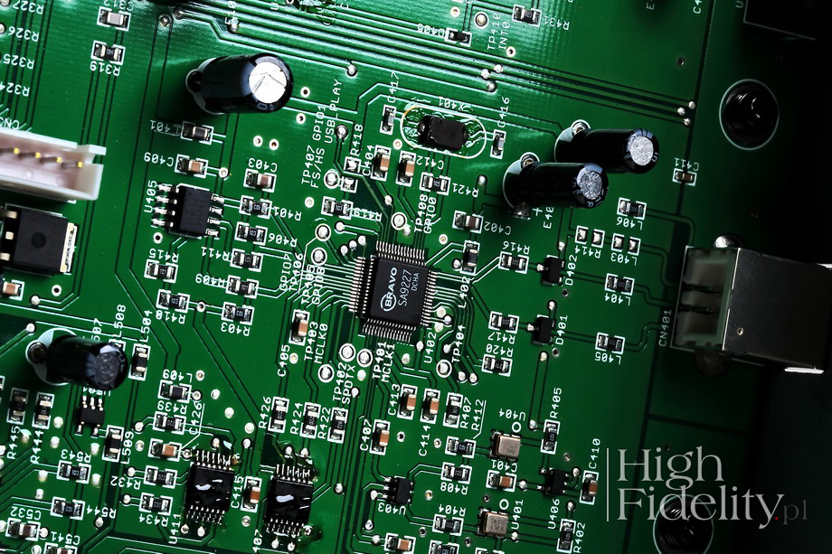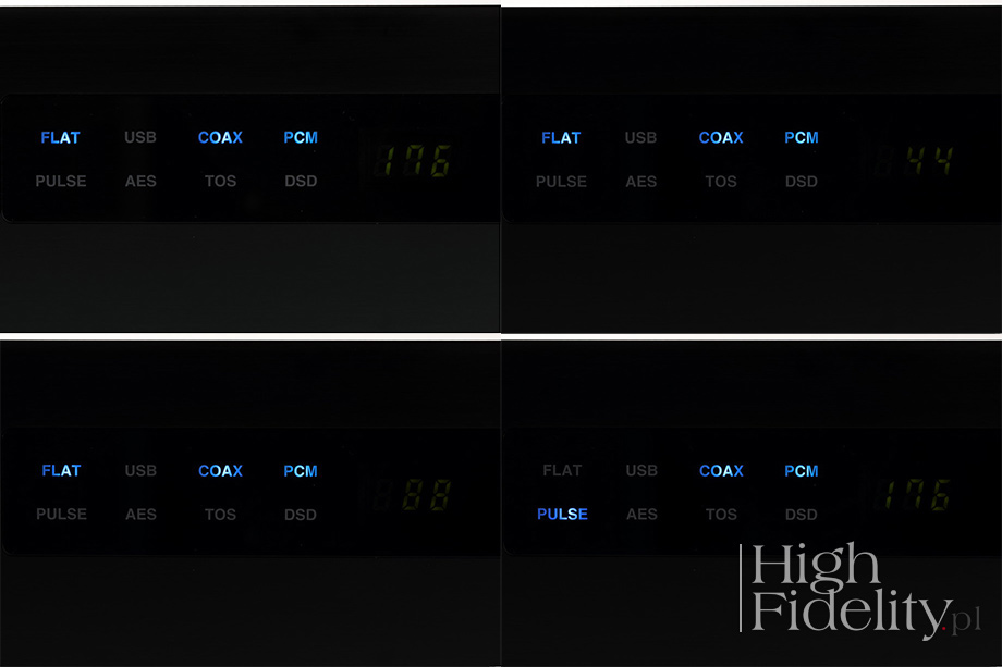 Wszystkie świecące elementy możemy przyciemnić lub wyłączyć. Kiedy to zrobimy przetwornik wygląda, jakby był całkowicie wyłączony. Myślę, że w tym przypadku po wyłączeniu powinna się świecić dioda wskazująca, że urządzenie działa, a po podaniu na wejście sygnału na chwilę wszystko rozświetlać, informując o tym, jaki sygnał jest dostarczany. Przód i tył Niebieskie napisy informują o wybranym wejściu, typie sygnału oraz filtrze cyfrowym. Wejścia są cztery: AES/EBU, TOSLink, RCA oraz USB. Trzy pierwsze przyjmują sygnał PCM od 16/32 do 24/192, są więc bardzo konserwatywne. Dostęp do sygnału DSD oraz DXD oferuje wejście USB: DSD 2,8224 MHz – 11,2896 MHz (DSD64-DSD256), PCM 16 bitów/32 kHz – 32 bity/384 kHz. Producent dał nam dostęp do dwóch filtrów cyfrowych, oznaczonych jako „Flat” i „Pulse”. Ten pierwszy jest klasycznym filtrem typu FIR ze stromym opadaniem poza pasmem przenoszenia i symetrycznymi oscylacjami przed i po impulsie. „Pulse” jest filtrem optymalizowanym tak, aby zlikwidować oscylacje przed impulsem. Płacimy za to szybszym opadaniem pasma przenoszenia, jeszcze przed 20 kHz, i słabszym tłumieniem odbić lustrzanych (tzw. zniekształceń aliasingowych). Zmianę filtrów i wejść dokonujemy dwoma guzikami. Przyciemnienie i wygaszenie napisów dostępne jest tylko z pilota zdalnego sterowania. Na przedniej, wykonanej z aluminium ściance (pozostała część obudowy jest stalowa, a przez to ciężka) mamy jeszcze gniazdo słuchawkowe i niewielką gałkę siły głosu. Pracuje tam wzmacniacz słuchawkowy, którego siła głosu kontrolowana jest w domenie cyfrowej, od -99 dB do 0 dB, w krokach co 0,5 dB. Gałka ta kontroluje również wyjścia analogowe, teoretycznie można więc DA5 podłączyć bezpośrednio do końcówki mocy lub aktywnych kolumn. Po całkowitym odkręceniu gałki sygnał nie jest tłumiony, a napięcie wyjściowe wynosi podręcznikowe 2 V dla wyjść RCA i 4 V dla XLR. Środek Urządzenie ma budowę zbalansowaną, stąd obecność na tylnej ściance obydwu typów wyjść analogowych – symetrycznych XLR i niesymetrycznych (single-ended) RCA. Jego układ elektroniczny zmontowano na pojedynczej płytce drukowanej, której towarzyszą płytki wzmacniacza słuchawkowego i wyświetlacza. Wejścia RCA, TOSLink i AES/EBU obsługiwane są przez odbiornik cyfrowy AKM AK4118. Dla wejścia USB przygotowano kość Bravo SA9227 tajwańskiej firmy SaviAudio Corporation. Prawdę mówiąc widzę ją po raz pierwszy. Po wybraniu wejścia sygnał trafia do układu ES9018K2M SABRE32 Reference DAC firmy ESS Technology. Obsługuje on sygnały PCM do 32 bitów i 384 kHz oraz DSD do DSD264. Pozwala też na wybór jednego z dwóch filtrów cyfrowych oraz zmianę siły głosu – z obydwu tych rzeczy w DA5 skorzystano. Przetwornik ten oryginalnie zaprojektowano do urządzeń przenośnych, jednak coraz częściej spotyka się go także w urządzeniach stacjonarnych wyższej klasy. Część analogowa jest zbalansowana. W każdym z kanałów pracują dwa układy scalone: Burr-Brown OPA2604 w konwersji I/U oraz JRC 4558 w filtrach wyjściowych. Przetwornik ES9018K2M pozwala na wybór trybu pracy wyjścia – napięciowy lub prądowy – ten ostatni tam, gdzie wymagana jest wyższa jakość dźwięku. Konieczne jest wówczas zastosowanie zewnętrznego konwertera I/U i – jak zakładam – tak właśnie zrobiono w DA5. Wokół układów operacyjnych Burr-Brown i JRC widać ładne kondensatory foliowe. Wszystkie oporniki i elementy aktywne są jednak montowane powierzchniowo. Podobnie wygląda zresztą wzmacniacz słuchawkowy – to prosty układ na pojedynczym scalaku JRC 2043.