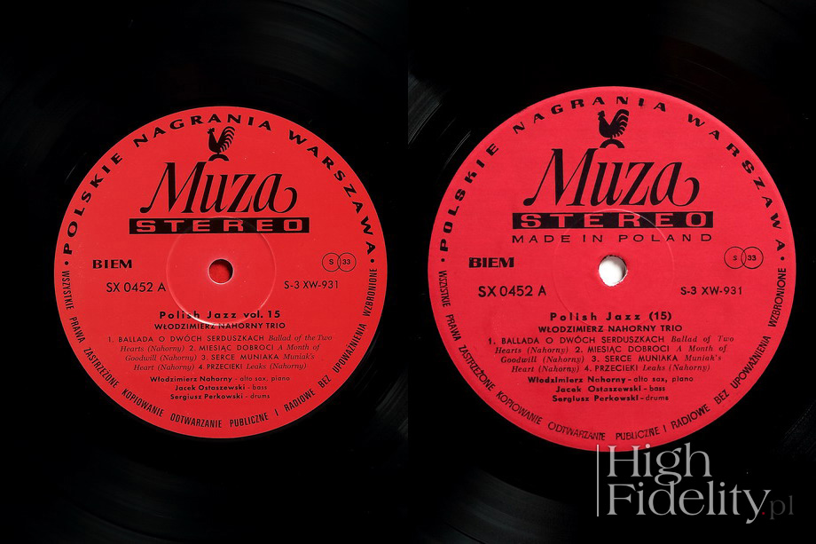 Porównanie nowego (po lewej) i wydania oryginalnego (po prawej) płyty winylowej Generalnie to bardzo czyste, konturowe granie. Bas schodzi znacznie niżej niż w oryginale, a i góra jest mocniej rozbudowana. Pierwsze wydanie brzmi w miększy sposób, bardziej „fizjologicznie”, zaś remaster mocniej, dokładniej. To na nim lepiej słychać pogłosy i przyśpiewy wydawane przez muzyków, jak i elementy pozamuzyczne, np. klapy w saksofonie Nahornego. Płyta nie szumi, mamy bardzo mało trzasków, a osoba nacinająca acetat wykorzystała całą powierzchnię każdej ze stron, dostosowując szerokość rowka do dynamiki w danym momencie. Dla tych, którzy nie znają cyfrowego wydania z 2004 roku, a jedynie oryginalny winyl, zaskoczeniem może być monofoniczna wersja utworu zamykającego to wydawnictwo, tj. Na wysokiej Cyrli, którą znajdujemy w reedycji. W oryginale fortepian i kontrabas rzeczywiście są na jednej linii, ale perkusja ma wyraźnie osobną „przestrzeń”. Ciekawe, czy chodziło o to, że oryginalna wersja miała jakieś wady techniczne (np. ubytki taśmy)? W każdym razie w Remasterze 2016 utwór ten wyraźnie odstaje brzmieniem od pozostałych, ma więcej patyny i przypomina monofoniczne nagrania ze studia Rudy’ego Van Geldera.