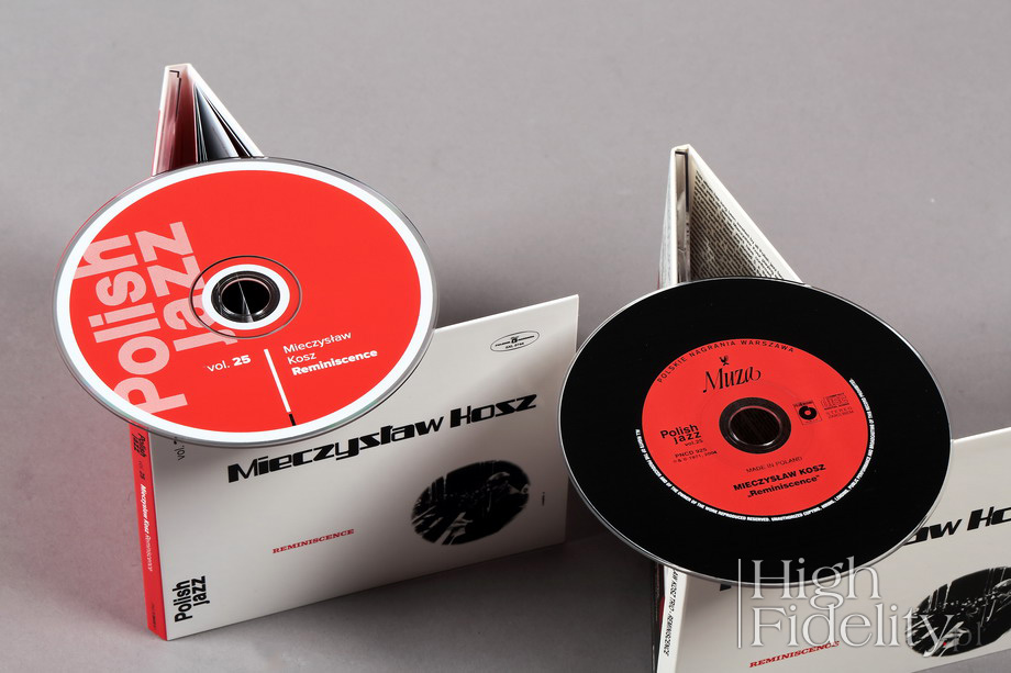 Labele wydania oryginalnego (po lewej) i nowego (po prawej) Także czystość i klarowność instrumentów w nowej wersji są lepsze. Nie przechodzi to w jaskrawość ani jasność i to oryginał wydaje się być nieco bardziej agresywny i konturowy. Reminiscencje są więc pierwszą płytą w tej szóstce, która w wersji winylowej brzmi co najmniej tak dobrze, jak oryginał, a może nawet lepiej. Zaskakują np. wyjątkowo dojrzałe, ładne, czyste, ale i „słodkie” kiedy trzeba wysokie tony Remasteru 2016. No i fortepian – w nowej wersji odzyskał czystość tonu, atak i wybrzmienie. Dodajmy, że oryginał wcale nie brzmi bardziej miękko i przyjaźnie niż remaster, jest wręcz odwrotnie. COMPACT DISC: Podobna sytuacja, jak przy płycie Heart tria Nahornego – wersja cyfrowa Compact Disc jest tak dobra, że nawet oryginalny winyl wydaje się być gorszy. To nie do końca prawda, jednak Jacek Gawłowski przygotował remaster, który łączy w sobie miękkość, spójność i płynność. Fortepian Kosza brzmi tu pięknie, gładko i dźwięcznie. W wersji CD z 2004 roku (tzw. „Anex”) jest mocno wypchnięty do przodu, podobnie zresztą jak pozostałe instrumenty. Starsza wersja jest o jakieś 3-4 dB głośniejsza, co sugeruje zastosowanie mocniejszej kompresji. Remaster 2016 w wersji cyfrowej jest doskonale spójny. Przesłuchałem pod tym kątem oryginalne wydanie winylowe i nawet ono wydaje się trochę bardziej indywidualistycznie traktować poszczególne instrumenty, wypychając fortepian na pierwszy plan i chowając perkusję i kontrabas. Pod tym względem nowa cyfrowa wersja jest po prostu lepsza, bo bardziej wiarygodna i zarazem przyjemniejsza w słuchaniu. Doskonała robota, zarówno w wersji winylowej, jak i CD! Dodajmy jeszcze jedno: to piękna muzyka.