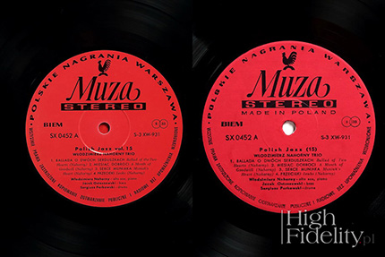 Materiał został przeniesiony na dysku twardym do studia masteringowego JG Master Lab i tam dokonano ponownego masteringu w domenie cyfrowej. Jacek starał się przy tym nie dotykać kompresji, poza oczywistymi przypadkami. Mastering dokonany został pod kątem wydania CD; na potrzeby płyty LP materiał był przygotowywany w tłoczni i acetat nacięto z pliku cyfrowego hi-res. Oznacza to, że po stronie tłoczni leżało zdekodowanie sygnału cyfrowego w przetworniku D/A – niestety nie wiemy jakim. Wszystkie poprzednie krążki LP tłoczone były w czeskiej firmie GZ Media. Nie wiem, czy tak jest w dalszym ciągu – nowa seria jest bowiem lepiej przygotowana i nosi inne oznaczenia umieszczane przy wyklejce. ![]() WŁODZIMIERZ NAHORNY TRIO Polskie Nagrania „Muza”/Warner Music Poland