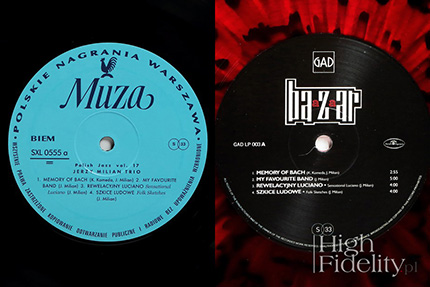 Labele wydania oryginalnego (po lewej) i wydania GAD Records (po prawej) COMPACT DISC: Nowa cyfrowa wersja jest dobrą próbką tego, co wnosi do Polish Jazzu seria Remaster 2016. Dźwięk jest miękki, uczciwy, namacalny. Idealnie połączono selektywność ze spójnym brzmieniem. Wersja cyfrowa jest nieco lepsza niż analogowa, przede wszystkim za sprawą precyzyjniejszego różnicowania barw i lepszej rozdzielczości. Lepiej też prowadzone są wysokie tony, na winylu trochę „dobite”. Oryginał jest lepszy od obydwu wersji, ale niewiele – to ostatecznie nie jest najlepsza rejestracja, jaką znamy. Ciekawe, ale w przypadku płyt CD nie znalazłem większych różnic pomiędzy wersją wydawnictwa GAD i nową wersją. Są, oczywiście że są, ale nie mają one waloru stratyfikującego. Bo jeśli wersja Remaster 2016 jest bardziej miękka, bardziej spójna, a przez to bliższa winylowemu oryginałowi, to wersja GAD jest bardziej dynamiczna, z mocniej zaznaczanym atakiem, co znam z analogowych taśm (nie tej konkretnej, ale ogólnie). Remaster 2016 brzmi „legato”, raczej łączy niż dzieli, a wersja GAD-a lepiej pokazuje poszczególne instrumenty, nie zawsze łącząc je w jeden organizm. Na tym tle najstarsza wersja CD z serii Polish Jazz Deluxe wydaje się najbardziej konserwatywna, bo ma mocny niski bas i nie do końca rozdzielczy środek. Ale łączy w sobie i dążenie do grania razem i do pokazywania osobnych wydarzeń. Gdyby to był bardziej rozdzielczy dźwięk, byłaby to najlepsza dotychczasowa wersja cyfrowa.