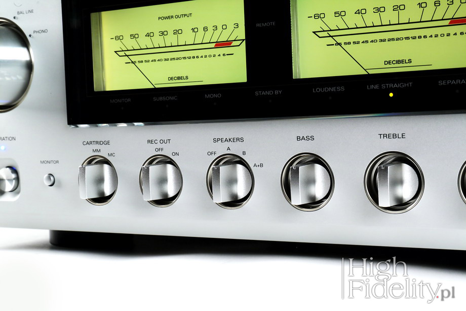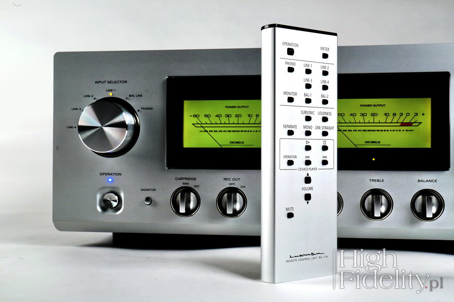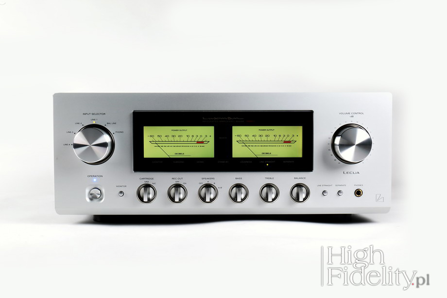 Jest ono więc duże – duży jest zasilacz i duże są radiatory chodzące tranzystory wzmacniacza mocy. Pamiętajmy o pozostawieniu wokół urządzenia wolnej przestrzeni! Przód i tył Stylistyka Luxmana jest znana, celuje w lata 70. ubiegłego stulecia. W nowych modelach jest ona jednak złagodzona i prezentowana przede wszystkim przez podświetlane na żółto-pomarańczowy kolor wskaźniki wychyłowe i szklaną płytkę za którą zostały umieszczone. Podświetlenie wskaźników zmienia kolor w zależności od światła otoczenia – w świetle dziennym mają ciemny kolor, a np. w świetle LED przypominają fluoroscencyjno-zielony. Pod wskaźnikami mamy rządek pomarańczowych diod LED, informujących o wyborze jednej z funkcji, takich jak: monitorowanie wejścia z magnetofonu (kolejny, zamierzony, anachronizm), filtr „subsonic” (dla gramofonów niższej klasy lub zniszczonych płyt LP) tryb mono, „loudness”, rozłączenie przedwzmacniacza i wzmacniacza mocy, tryb „straight line”, w którym odłączona jest regulacja barwy, oraz „standby”.