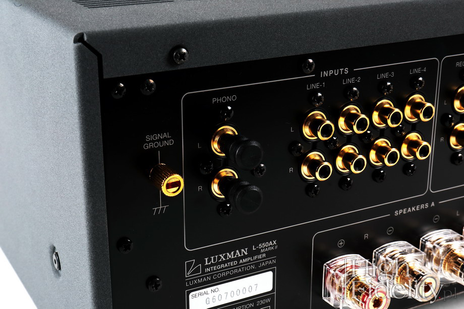 Jeślibyśmy zapomnieli na chwilę o niebieskiej diodzie LED – chociaż w powszechnym użyciu elementy o nazwie Light-emitting diode są od 1968 roku, to akurat niebieska dioda po raz pierwszy została sprzedana w 1994 roku – taki wstęp mógłby się ukazać w teście z lat 70. XX wieku. Niemal na pewno byłby to test polegający na opisie technicznym i pomiarach, bez części odsłuchowej. A to dlatego, że dziennikarze związani z audio byli przekonani, że wzmacniacze, które mają podobne pomiary brzmią identycznie. Zmienił to dopiero sukces „Stereophile’a” – chociaż pismo powstało w 1962 roku jego wpływ na zmianę myślenia o audio można liczyć dopiero od późnych lat 70. Wrażenie przeniesienia się w przeszłość jest o tyle zasadne, że Luxman, firma powstała w 1925 roku, część urządzeń stylizuje właśnie na tę dekadę. Powodem są przede wszystkim wychyłowe VU-metry wskazujące moc wyjściową, ale i kształt gałek oraz ich rozmieszczenie. Uprawomocnia do tego również rozbudowana funkcjonalność urządzenia. | L-550AX MARK II L-550AX MARK II to wzmacniacz zintegrowany – duży i ciężki. Pomimo to jego moc wyjściowa może się wydać nieledwie symboliczna: zaledwie 20 W przy obciążeniu 8 Ω i 40 W 4 Ω. Zwróćmy jednak uwagę na podwajanie mocy przy zmniejszeniu impedancji o połowę – to oznacza dobrą wydajność prądową (tzw. „sztywny zasilacz”). Niska moc i duże rozmiary oraz spora waga mówią też o czymś innym: mamy do czynienia ze wzmacniaczem pracującym w klasie A, we wszystkich sekcjach, również prądowej. Można go porównać do wzmacniacza lampowego push-pull z kilkoma parami lamp pracującymi równolegle. Wzmacniacz oferuje sześć wejść liniowych, w tym jedno symetryczne XLR, jak również wejście dla gramofonu, MM i MC. Jest tu również wyjście słuchawkowe, wyjście do nagrywania oraz wejście na końcówkę mocy i wyjście z przedwzmacniacza. O tym, że nie jest to minimalistyczny projekt wiemy zresztą tuż po rzuceniu okiem na przednią ściankę: gałki, gałeczki, wskaźniki, przyciski i diody elektroluminescencyjne. Oprócz zmiany siły głosu w opatentowanym układzie LECUA i zmiany wejścia możemy regulować barwę dźwięku, wybrać aktywne wyjścia głośnikowe (dwie pary), zmienić balans, włączyć tryb mono. A jeśli chcemy, przyciskiem „Straight line”, możemy ominąć sekcję zmiany barwy. Uzyskamy w ten sposób lepszy dźwięk. ![]() Wzmacniacz porównywany był do dzielonego systemu złożonego z przedwzmacniacza liniowego Ayon Audio Spheris III i końcówki mocy Soulution 710 oraz do wzmacniacza lampowego Qualiton A50i, węgierskiego urządzenia opartego na lampach KT120 pracujących w klasie A; jego moc wyjściowa wynosiła 50 W. ![]() Płyty użyte w odsłuchu (wybór)