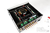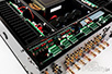 Po bokach szklanego okienka umieszczono duże gałki – po lewej zmiany wejść, a po prawej siły głosu. Wybrane wejście sygnalizowane jest pomarańczową diodą LED; wskazanie siły głosu jest mniej widoczne. Poniżej, w rządku, mamy ładne, wygodne w użyciu gałki, którymi: wybieramy rodzaj używanej przez nas wkładki gramofonowej, aktywujemy wyjcie do nagrywania, wybieramy aktywne wyjście głośnikowe – są dwa, A i B - zmieniamy barwę i balans między kanałami. Małymi przyciskami włączamy monitorowanie wejścia z magnetofonu, omijamy regulację barwy dźwięku (niestety bez trybu „loudness”) i rozłączamy przedwzmacniacz i końcówki mocy. Obok jest jeszcze gniazdo słuchawkowe. Ze schematu blokowego zamieszczonego w instrukcji czytamy, że jest ono podłączone równolegle do wyjścia głośnikowego, tj. nie mamy osobnego wzmacniacza słuchawkowego. To urządzenie japońskie, stylizowane na lata 70., tak więc i jego tył jest szczelnie zapełniony gniazdami. Podzielono je na dwie główne sekcje – liniową na górze i prądową na dole. W tej pierwszej uwagę zwraca odsunięte od pozostałych wejścia gramofonowe, zwarte wtyczkami RCA. To dobry pomysł, aby zwierać nieużywane wejścia i ekranować wyjścia – we wszystkich swoich urządzeniach stosuję do tego najlepsze elementy tego typu, jakie znam – Acoustic Revive SIP-Q8 oraz IP-Q2. Luxman jest jednym z nielicznych producentem elektroniki, który robi to od razu, z najbardziej szumiącym wejściem. Jeśli z niego korzystamy, wystarczy wyjść wtyki z gniazd. Obok widać cztery par wejść liniowych RCA, oznaczone ‘Line 1…Line 4’. Kolejne dwie pary to wejście i wyjście pętli do nagrywania, a cztery następne to wyjście z przedwzmacniacza i wejście na końcówkę mocy. Te ostatnie można wykorzystać na kilka różnych sposobów – albo dokupując końcówkę mocy, przedwzmacniacz, lub używając Luxmana w systemie kina domowego. Rozłączanie tych sekcji wykonywane jest na przekaźnikach. I jest wreszcie para wejść liniowych XLR dla sygnału symetrycznego. Warto jednak wiedzieć, że za wejściem sygnał jest desymetryzowany, korzystajmy więc z nich tylko jeśli używamy bardzo długich kabli połączeniowych. Pod spodem są dwie sekcje wyjść głośnikowych ‘A’ i ‘B’ oraz gniazdo zasilające. Gniazda głośnikowe są złocone, akceptują banany i widełki. Gniazdo zasilające ma tylko dwa bolce, bez bolca ochronnego, zdarza się to również w produktach Denona i Marantza. Zadbajmy więc, aby gdzieś indziej w systemie był aktywny kabel ochronny. Środek Luxman, dobrym zwyczajem, podaje w instrukcji obsługi schemat blokowy urządzenia. Czytamy z niego, że przedwzmacniacz gramofonowy ma korekcję RIAA realizowaną w pętli sprzężenia zwrotnego, że za gniazdami XLR sygnał jest desymetryzowany i że skrócenie ścieżki przyciskiem „stright line” nie dotyczy przełączników „monitor” oraz „subsonic”. Przed układem regulacji siły głosu LECUA umieszczono bufor, a po nim układ wzmacniający przedwzmacniacza. Końcówki mocy zbudowano z wykorzystaniem tranzystorów bipolarnych – na wyjściu pracują cztery równoległe pary w trybie push-pull. Końcówki mocy przykręcono do bardzo solidnych, odlewanych radiatorów, a tranzystory sterujące do bardzo ładnie wyglądających płyt z miedzi. Układ elektroniczny przedwzmacniacza korzysta z dwóch głównych rozwiązań Luxmana, o których firma mówiła w teście modelu L-590AX MARK II: LECUA i ODNF. LECUA – LUXMAN Electrically Controlled Ultimate Attenuator – to niezwykle precyzyjny tłumik, zbudowany z wykorzystaniem przełączanych rezystorów. Ma on 88 kroków – od 0 do -87 dB – i zmienia siłę głosu bez pogarszania jakości sygnału. Przy danej głośności sygnał muzyczny przechodzi jedynie przez dwa oporniki. Ze względu na swoją budowę nie ma w nim żadnej odchyłki spowodowanej np. starzeniem się ścieżki oporowej, będzie więc służył przez bardzo długi czas. Najnowsza wersja układu o nazwie LECUA1000 została zastosowana we wzmacniaczach zintegrowanych L-590AX MARK II i L-550AX MARK II, jak również w przedwzmacniaczach C-900u i C-700u.