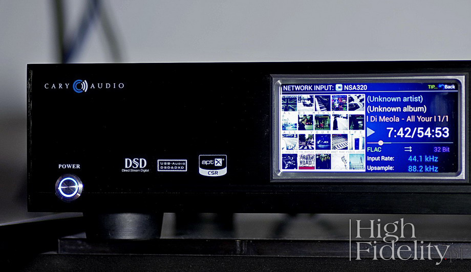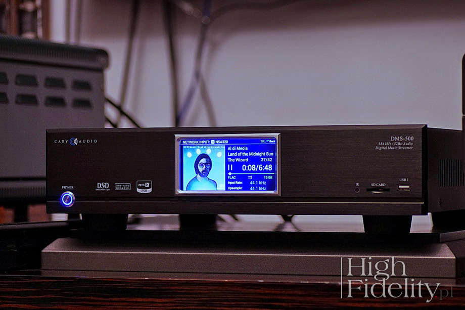Dziś w ofercie znajdziemy końcówki mocy oraz integry, już nie tylko na lampach, ale i z tranzystorami, przedwzmacniacze liniowe i gramofonowe, komponenty przeznaczone do kina domowego oraz źródła cyfrowe. Jednym z najnowszych, należącym do tej ostatniej grupy, dodatków do oferty jest odtwarzacz plików audio DMS-500, który jest odpowiedzią na ciągle rosnącą rolę plików. Po okresie fascynacji PC-Audio, kiedy to na topie były konwertery USB, a później „daki” z wejściami USB, umożliwiające odtwarzanie muzyki z laptopów i komputerów, nadszedł czas rozwiązań wygodniejszych, bardziej audiofilskich, a przede wszystkim łatwiejszych w obsłudze dla osób, które nie studiowały informatyki. | DMS-500 Taką właśnie propozycją jest testowany odtwarzacz Cary Audio. W przeciwieństwie do wcześniejszych propozycji tego producenta (DMS-600 i 600SE), które producent określał mianem „cyfrowych centrów muzycznych”, wyposażonych w napędy CD i szereg wejść cyfrowych, tym razem zaproponowano odtwarzacz plików audio. Zamiast opcji odtwarzania srebrnych krążków dostajemy więc możliwość odtwarzania muzyki z domowej sieci, przewodowo i bezprzewodowo (WiFi, Bluetooth, również z aptX, AirPlay). Dotyczy to zarówno NAS-ów, jak i innych pracujących w sieci i udostępniających swoje zasoby urządzeń. Szereg wejść cyfrowych – dwa koaksjale S/PDIF, Toslink, AES/EBU, USB typu A – umożliwia korzystanie z innych źródeł cyfrowych, bądź odtwarzanie plików muzycznych z podłączonych do serwera zewnętrznych dysków USB, pendrajwów oraz kart SD (te ostatnie mogą być również wykorzystywane do aktualizacji oprogramowania urządzenia). Co ważne, Cary Audio posiada wbudowanego DAC-a (dwie kości AKM), dzięki czemu za pomocą wyjść analogowych (zbalansowanych lub niezbalansowanych) możemy podłączyć DMS-500 do wejścia przedwzmacniacza lub integry. Do dyspozycji są również wyjścia cyfrowe (koaksjalne i Toslink), które dają możliwość korzystania z zewnętrznego przetwornika cyfrowo-analogowego, jeśli – w przypadku audiofilów nieuniknione – ciągłe dążenie do doskonałości sprawi, że wbudowany DAC przestanie nam kiedyś wystarczać. DMS-500 ma wielkość standardowego komponentu, z solidną metalową obudową. Na froncie uwagę zwraca przede wszystkim pięciocalowy kolorowy wyświetlacz, na którym zobaczymy okładkę odtwarzanego albumu, wykonawcę, tytuł i czas utworu, częstotliwość próbkowania pliku oraz wartość, do jakiej został upsamplowany, jeśli korzystamy z tej opcji, plus długość słowa. Nie ma tu natomiast żadnych manipulatorów, poza wyłącznikiem zasilania. Sterowanie odbywa się bowiem za pomocą pilota zdanego sterowania. Tym ostatnim można właściwie wykonać każdą operację, od wyboru ustawień, aktywnego wejścia, obsługi odtwarzania, po włączanie i wybór upsamplingu, acz wyświetlacz nie jest na tyle duży, by bez sokolego wzroku wykonać te operacje z oddalonego o kilka metrów miejsca odsłuchowego. Upsampling jest własnym opracowaniem Cary Audio o nazwie PCM & DSD TruBit. Pozwala upsamplować dany format do postaci nawet 705,6 kHz (PCM) lub DSD256. Co ciekawe, w przeciwieństwie do wielu innych urządzeń umożliwiających upsampling, z którymi miałem do czynienia, tu odbywa się to w sposób płynny. Tzn. gdy przełącza się upsampling w trakcie odtwarzania nie następuje żadna przerwa w muzyce. Zastosowanie dwukanałowych kości DAC AK4490EQ umożliwia natywne odtwarzanie plików w formacie PCM o rozdzielczości do 32-bitów/384 kHz (plików WAV nawet do 768 kHz) oraz DSD64, 128, 256, a nawet 512; to ostatnie nie w przypadku używania DMS-500 jako tzw. „end point” dla programu Roon – wtedy możliwości odtwarzania kończą się na DSD256. Na stronie producenta można przeczytać o 60-dniowej próbnej wersji tego programu dostępnej dla użytkowników DMS-500, ale jako aktualny użytkownik nie próbowałem nawet tego sprawdzać. Fani MQA również będą zadowoleni, bo DMS-500 posiada stosowny certyfikat, a co więcej, niezależnie od częstotliwości próbkowania plików MQA, Cary upsampluje je x16, czyli odtwarzać będzie plik w rozdzielczości 705,6 lub 768 kHz. Na koniec dorzućmy do tego możliwość korzystania z serwisów Spotify, Tidal i vTuner. No tak, jest jeszcze regulacja głośności sterowana z pilota. Dzięki niej można wykorzystywać to urządzenie jako cyfrowy przedwzmacniacz łącząc go bezpośrednio z końcówką mocy, bądź, po ustawieniu głośności na wartość maksymalną, która daje 3 V sygnał wyjściowy, korzystać z niego jako ze źródła wysyłającego stały sygnał do przedwzmacniacza lub integry. Do sterowania urządzeniem można używać nie tylko pilota, ale również firmowej aplikacji „DMS-500” dostępnej na Androida i iOS. Do samego sterowania odtwarzaniem można wykorzystać Roona, bądź jakąś inną aplikację na urządzenia przenośne – sprawdziłem, że Cary działa bezproblemowo z Bubble UpnP. Czegóż chcieć więcej, że tak spytam? Od strony funkcjonalnej to urządzenie kompletne, choć ja, z racji mojego skrzywienia, życzyłbym sobie jeszcze lampowego wyjścia... :), ale jak wiadomo – ideałów nie ma. ![]() Płyty użyte w odsłuchu (wybór)