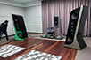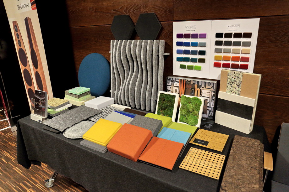 - Próbka materiałów i rozwiązań stosowanych przez polską firmę Nyquista, zajmującą się akustyką wnętrz. Spora część pomieszczeń na PGE była wyposażona w jej wyroby.